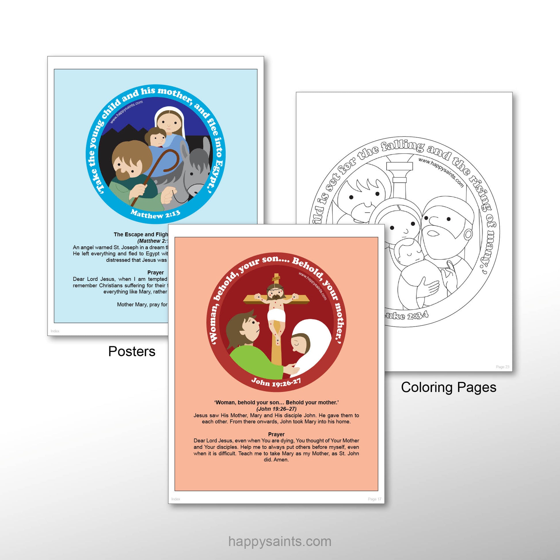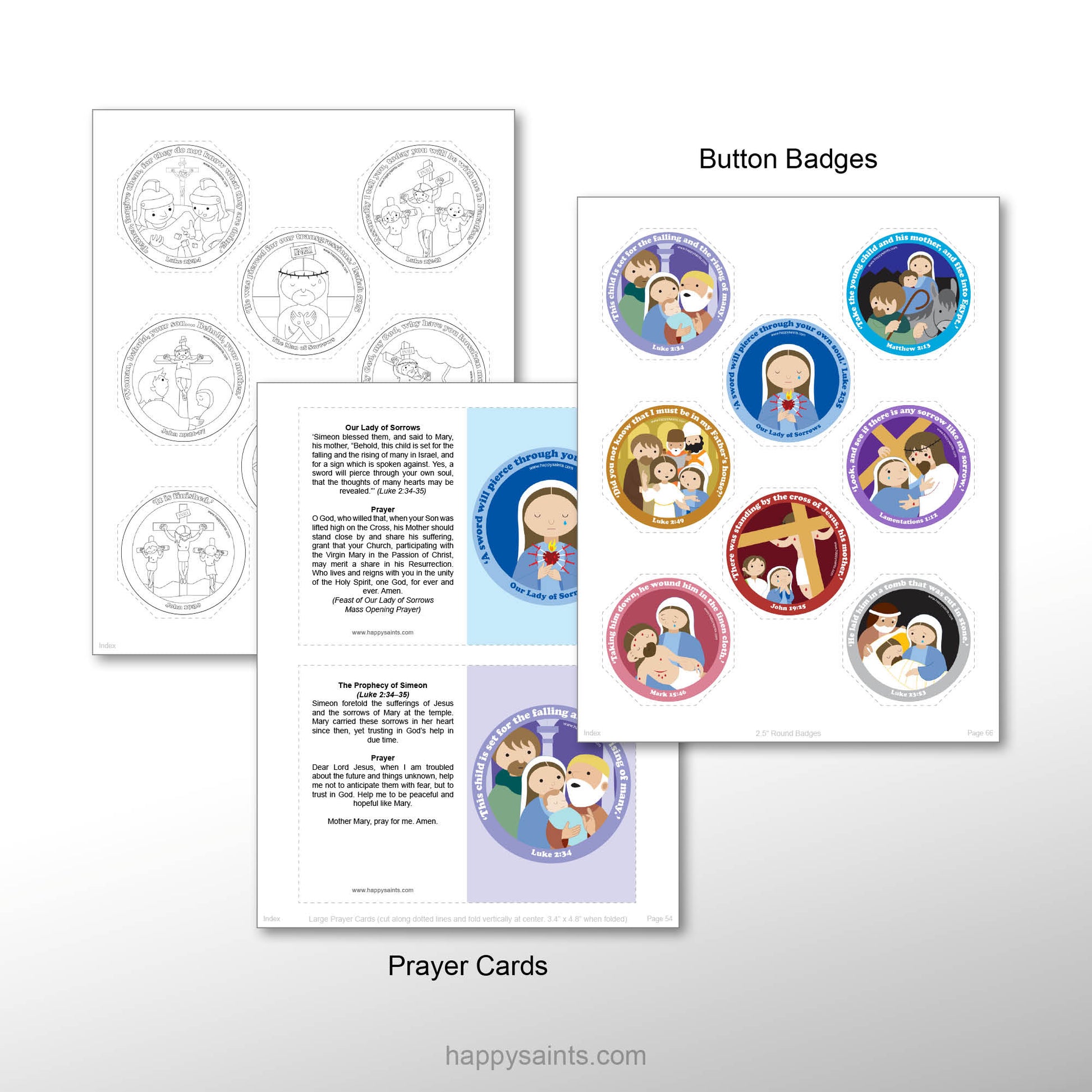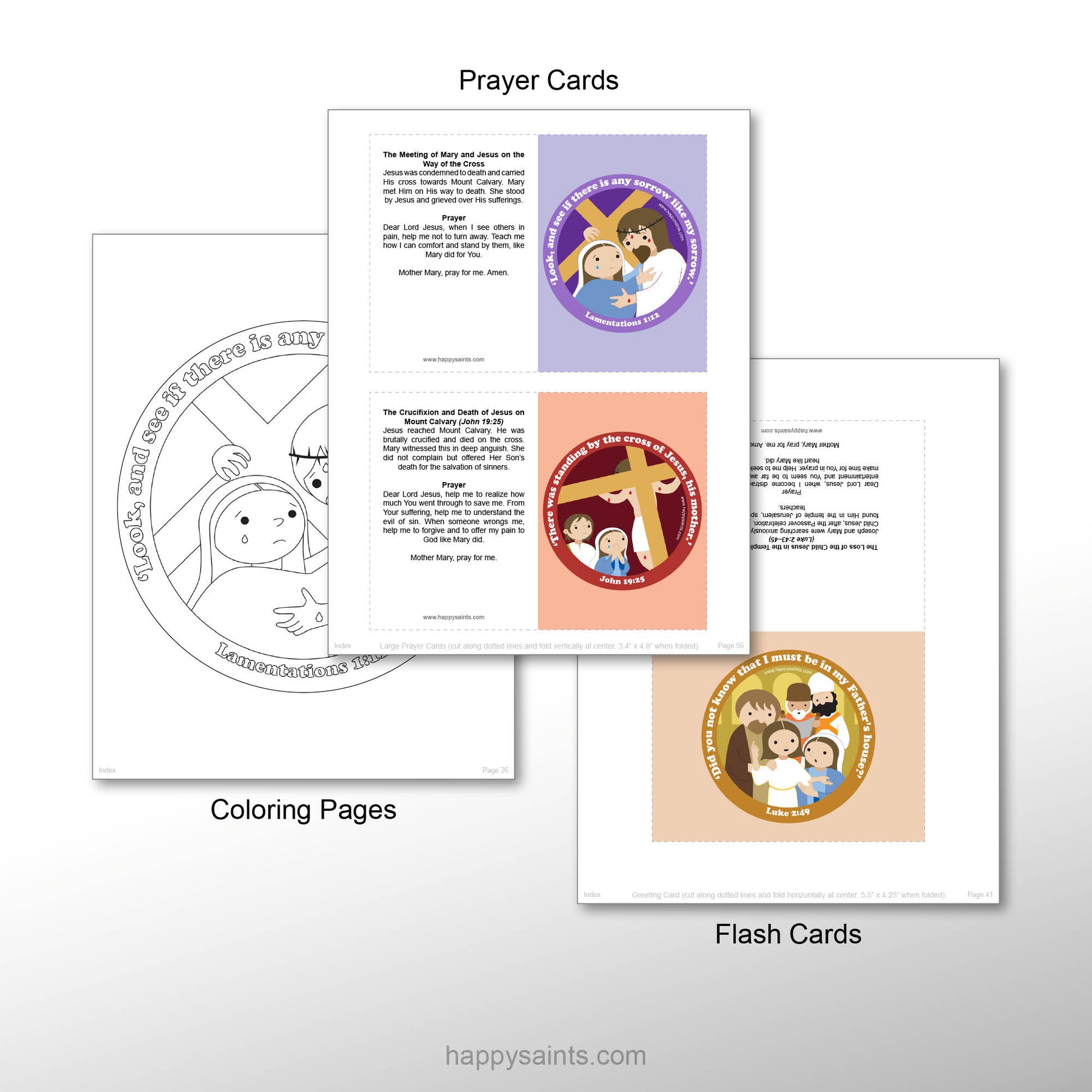 Packed in multiple printable formats, i.e. 8 inch x 10 inch posters, greeting cards, prayer cards, coloring pages and badges, the ebook is a very useful resource to educate and encourage kids and the young-at-heart to feel the Passion of Jesus and the Sufferings of Mary, especially during the Season of Lent.
