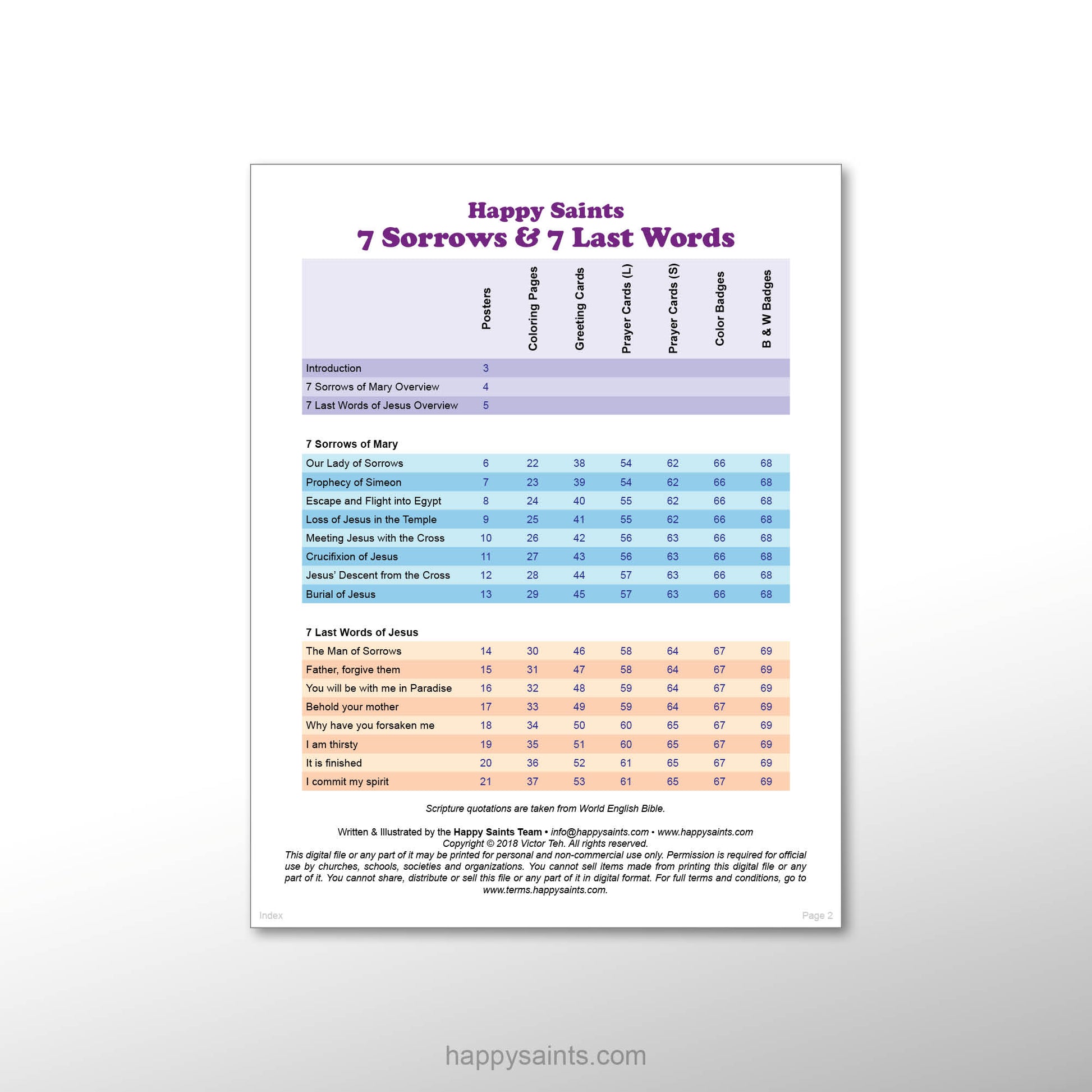 The Happy Saints 7 Sorrows and 7 Last Words eBook features 16 cartoon artworks of the Seven Sorrows of Mary and the Seven Last Words of Jesus on the Cross, with simple prayers and reflections.