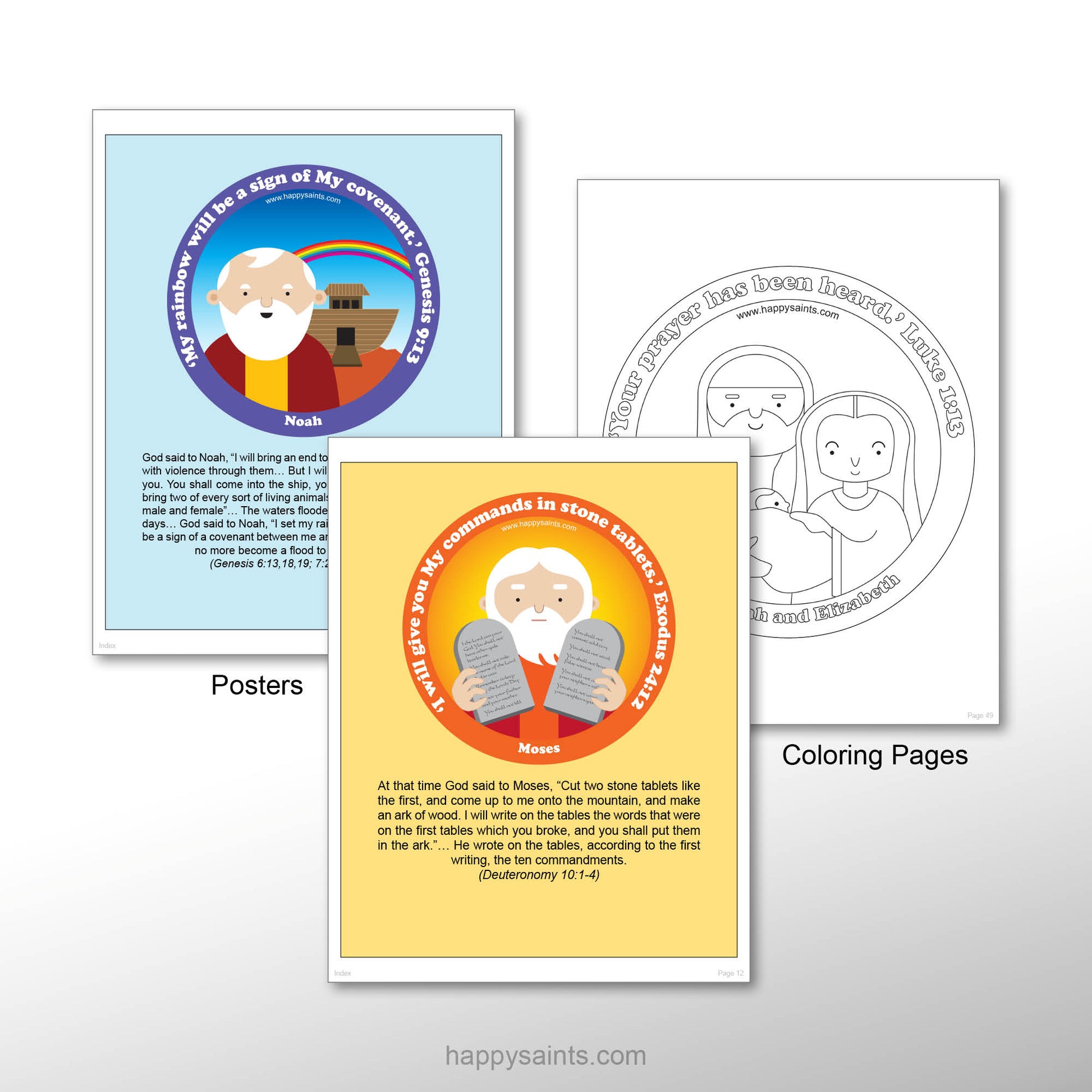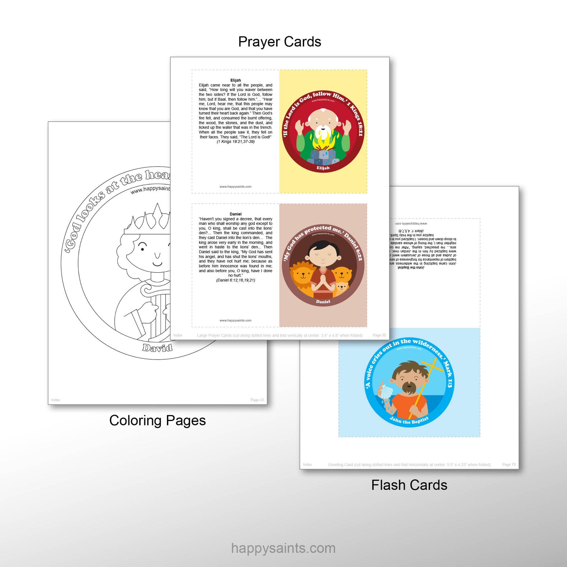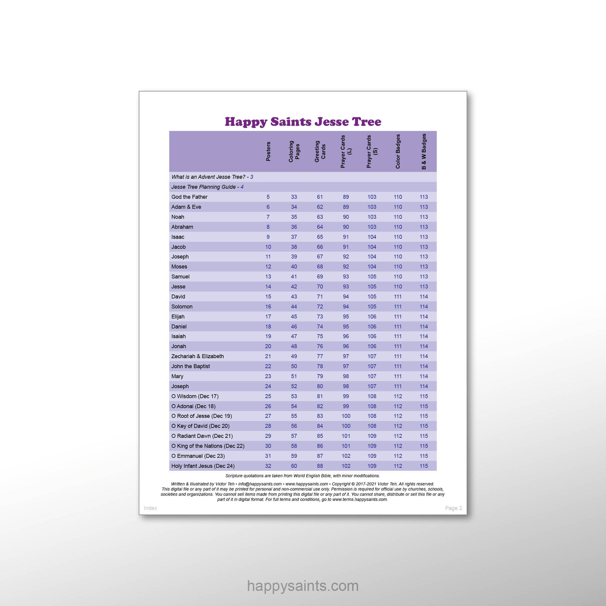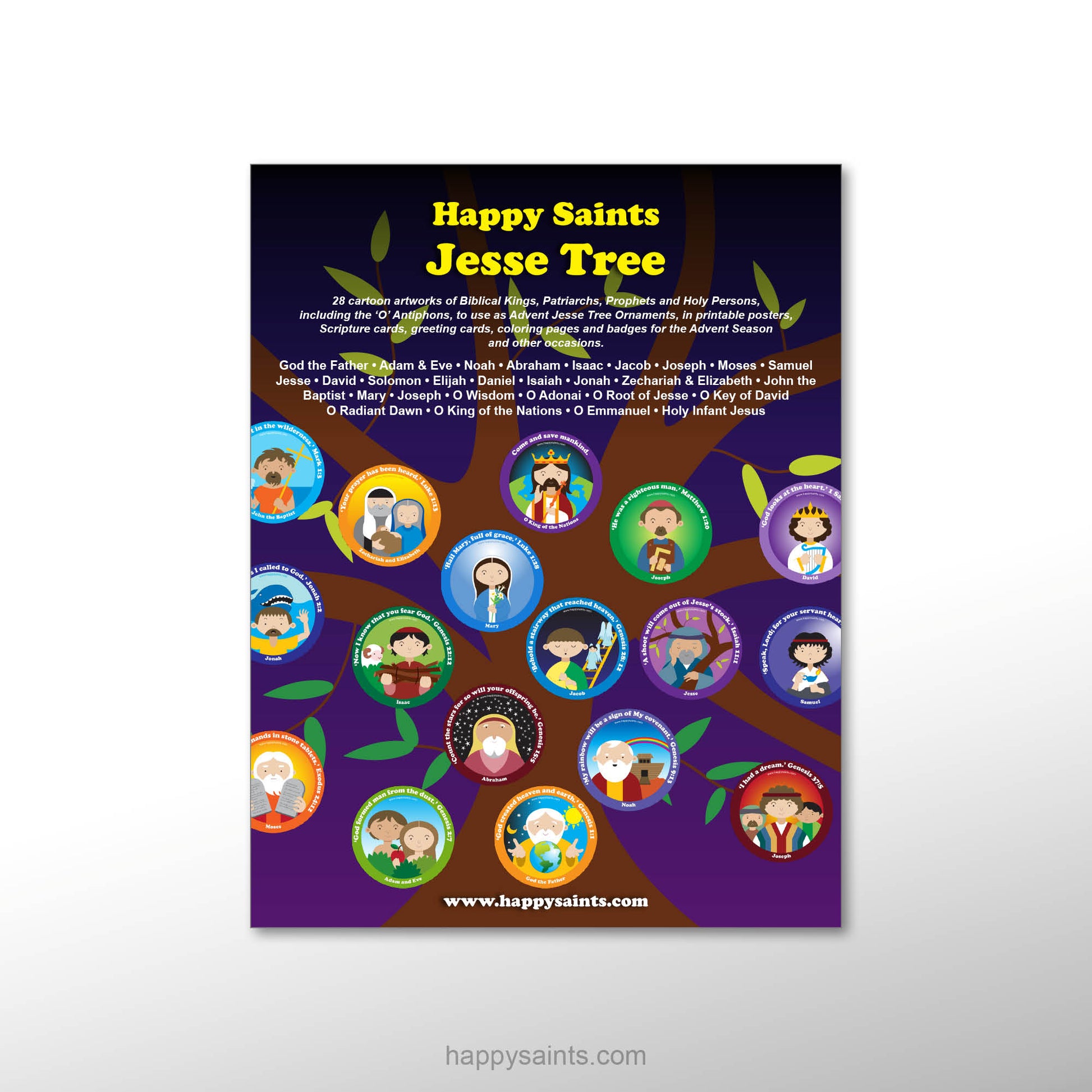 The Happy Saints Jesse Tree eBook features 28 cartoon artworks of Biblical Kings, Patriarchs, Prophets and Holy Persons, to use as Advent Jesse Tree Ornaments. The artworks are available in various printable formats: 8x10 posters, Scripture cards, greeting cards, coloring pages and badges.