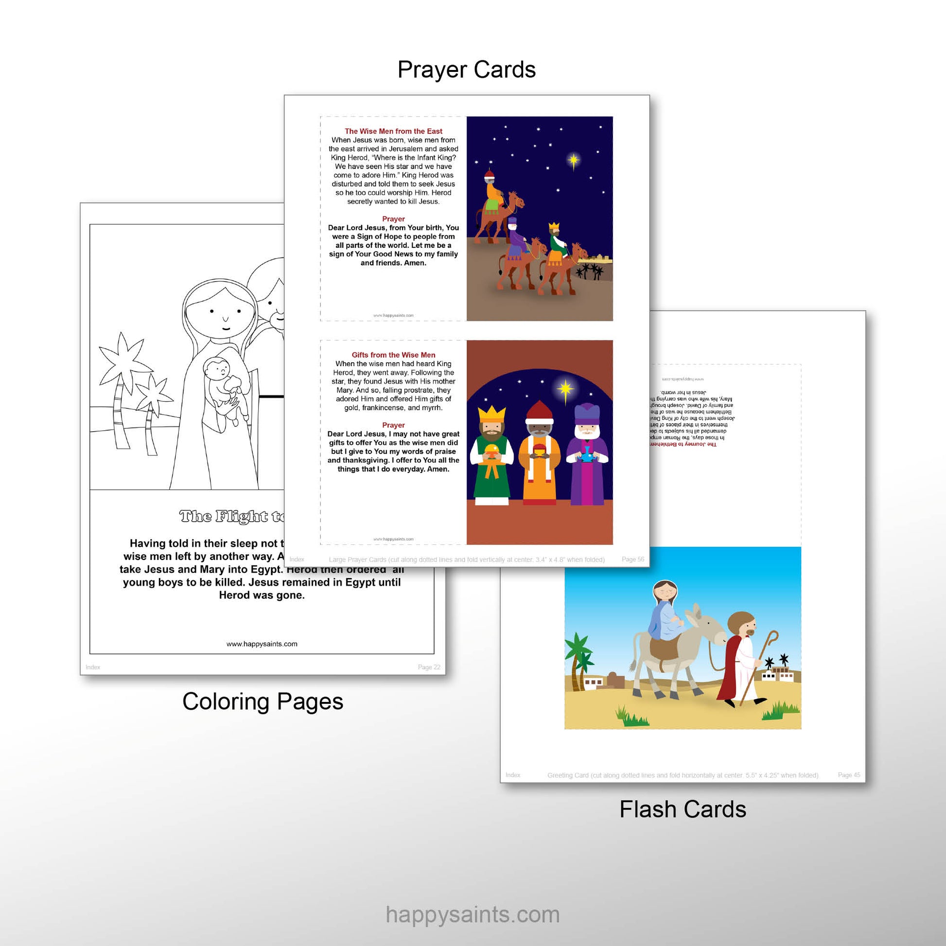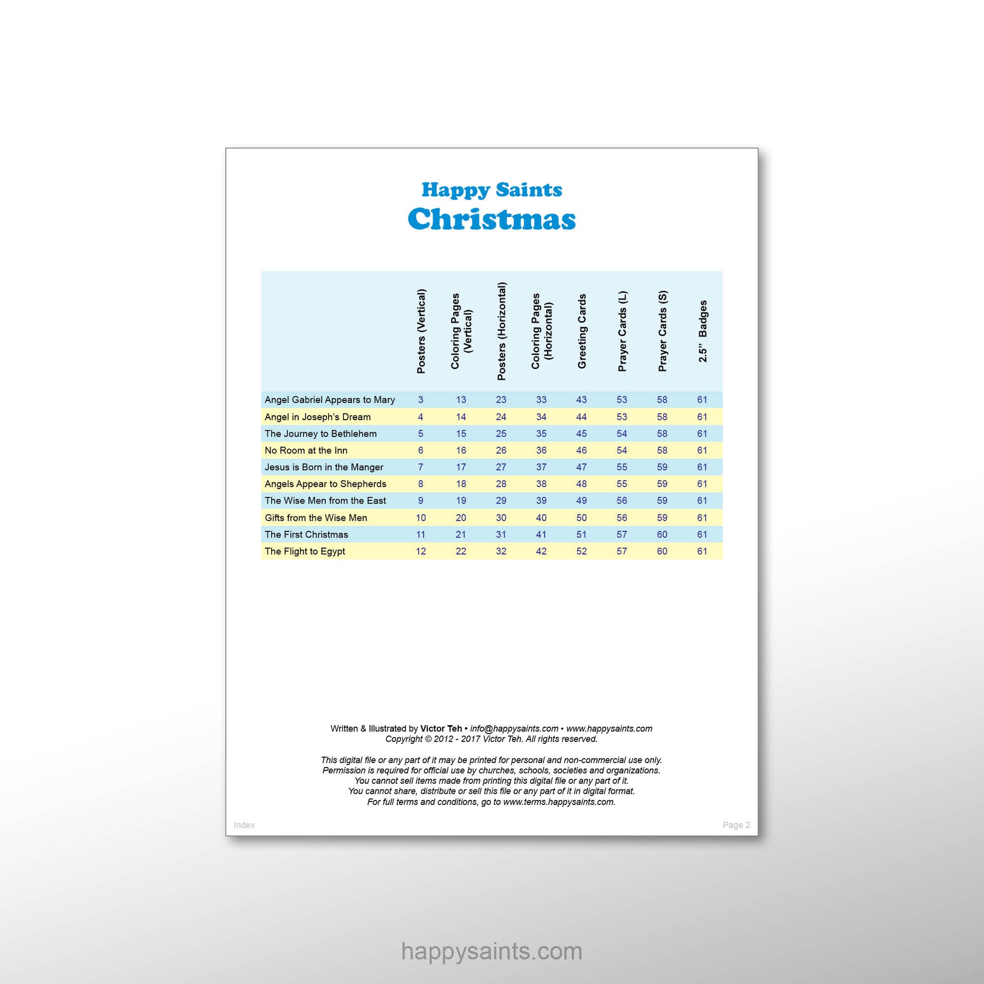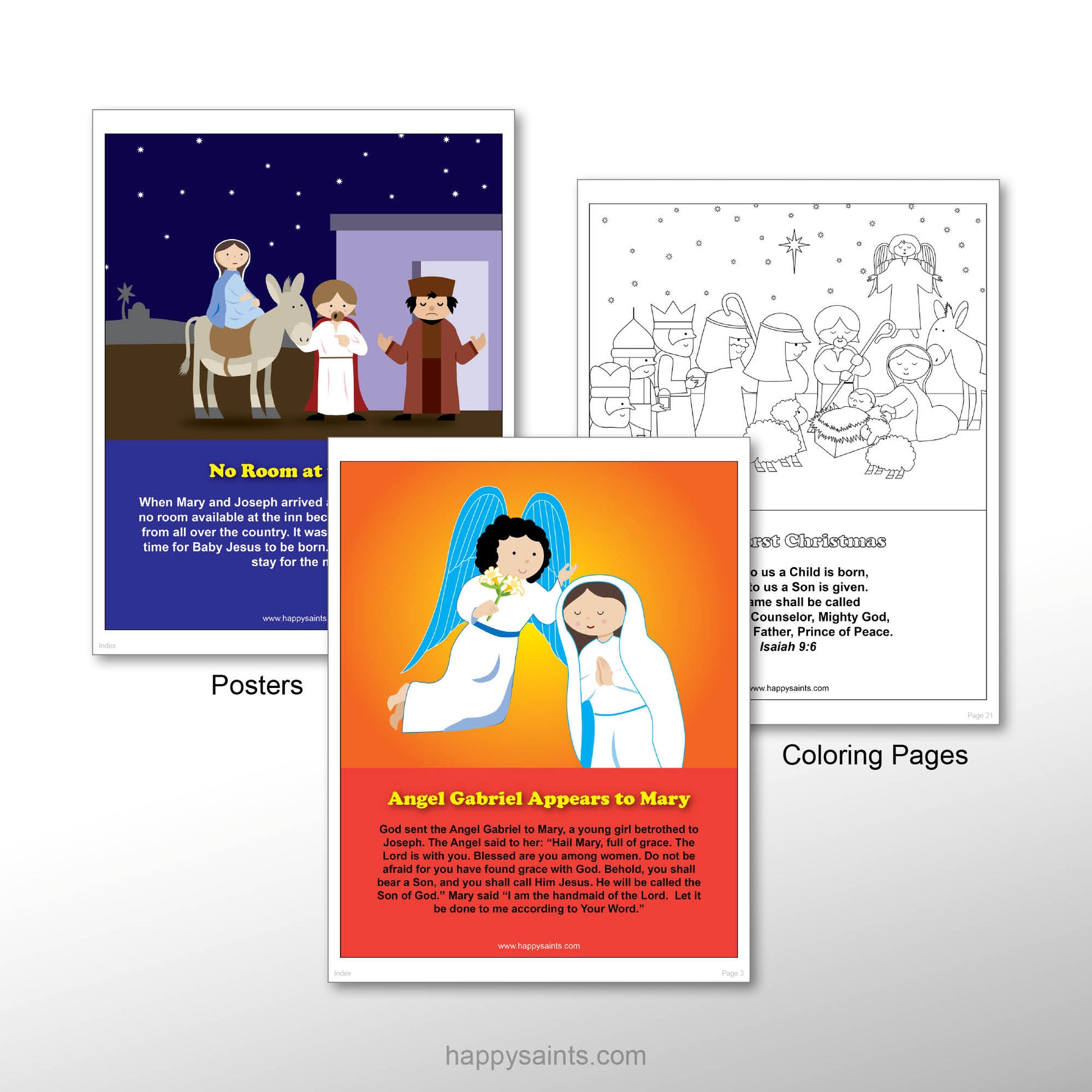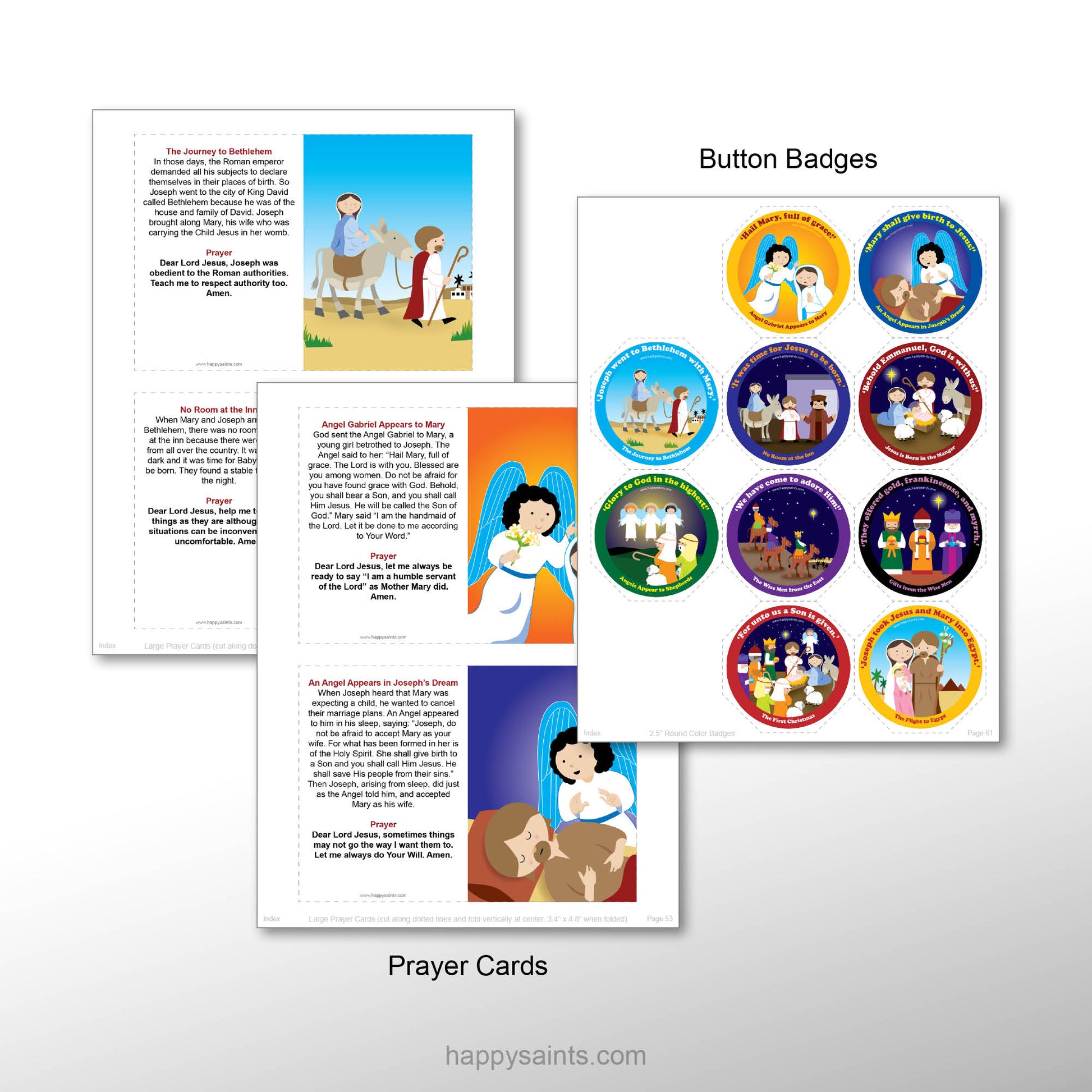 10 cartoon artworks of the Christmas Nativity story with short Scripture-based passages. In multiple printable formats, i.e. 8 inch x 10 inch posters, prayer cards, greeting cards, coloring pages and badges for the Seasons of Advent and Christmas and other occasions. Very useful resource to educate and encourage kids and the young-at-heart to learn about the true Christmas story. Great for parents, teachers, catechists, children and families!