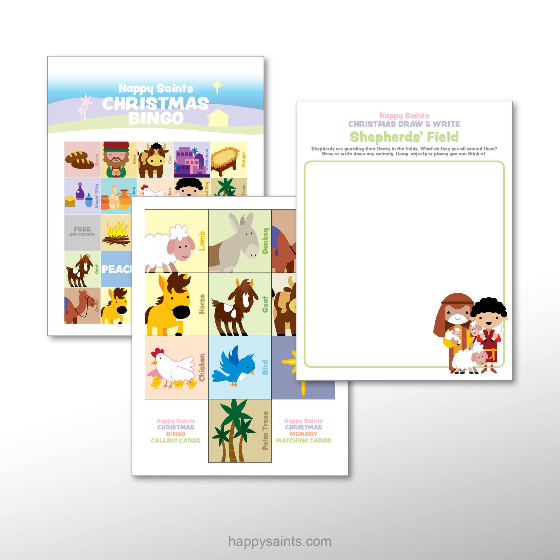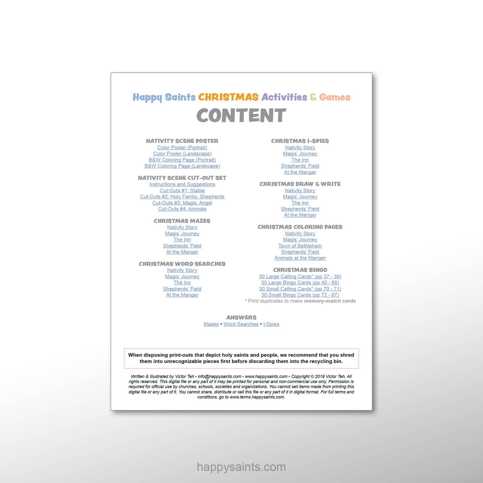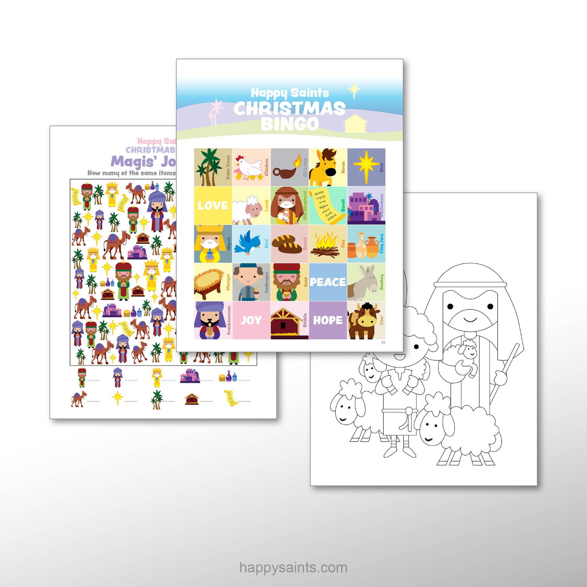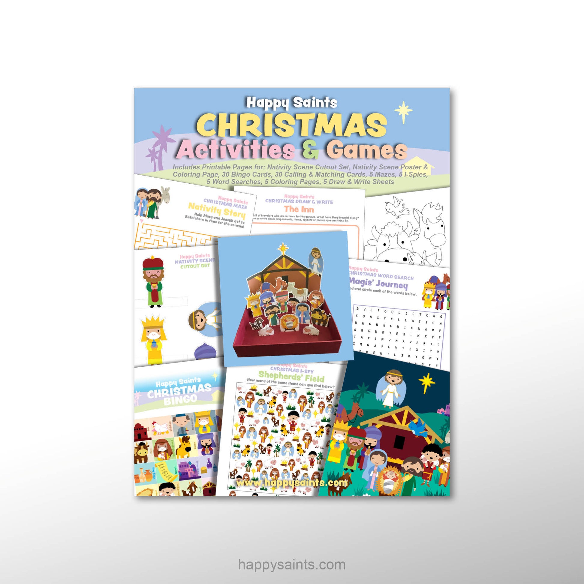 The Happy Saints Christmas Activities and Games PDF eBook includes many printable activities and games for kids and the young-at-heart during Advent and Christmas! Featuring cute and colorful Happy Saints cartoons, this resource is sure to keep everyone joyfully engaged in the Spirit of the Season!