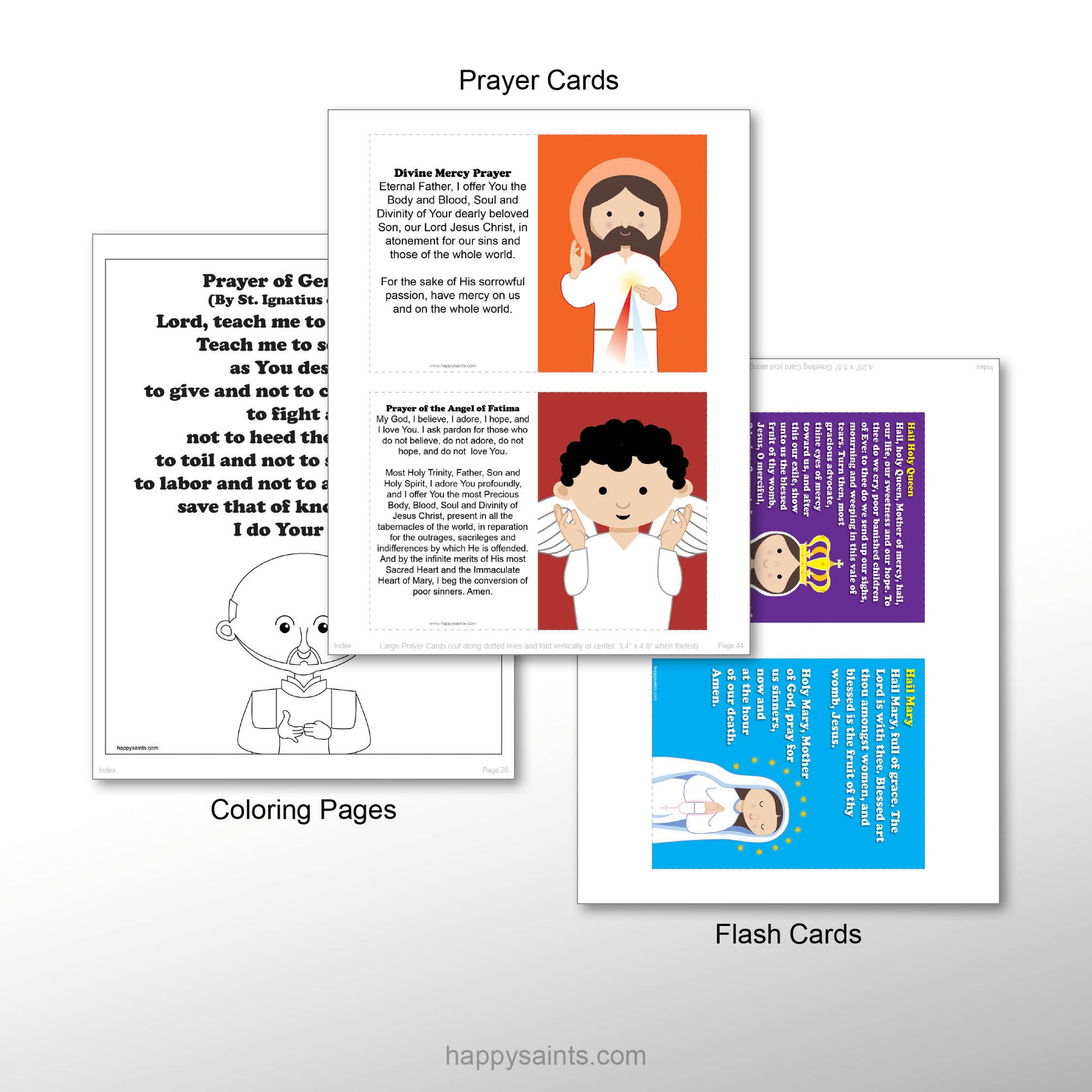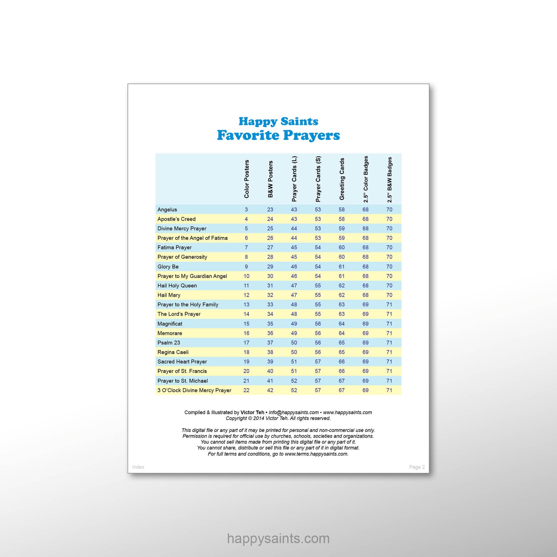 Cartoon artworks of 20 favorite traditional Catholic prayers. In multiple printable formats, i.e. 8 inch x 10 inch posters, prayer cards, greeting cards, coloring pages and badges for countless activities and occasions. Very useful resource to educate and encourage kids and the young-at-heart to pray. Great for parents, teachers, catechists, children and families!