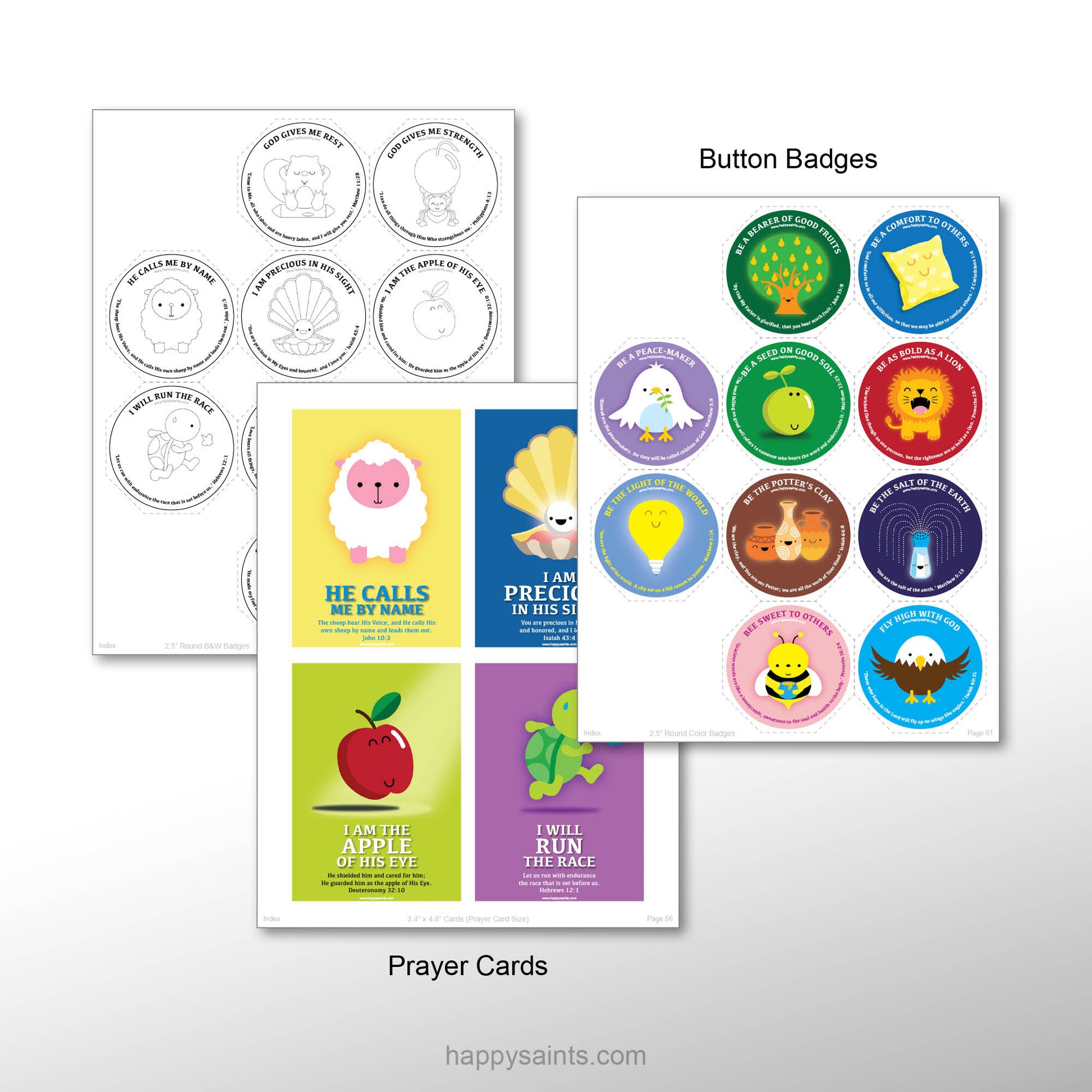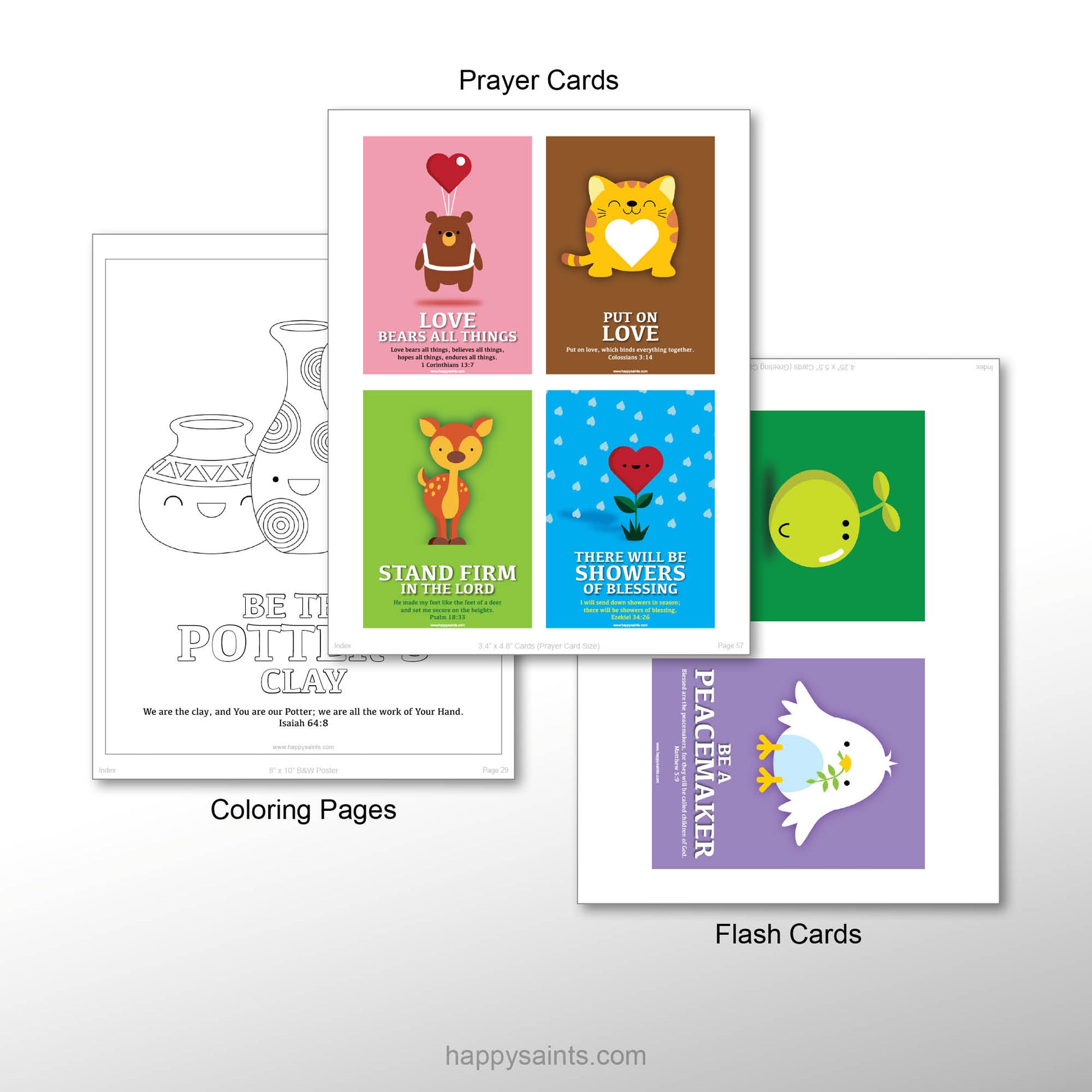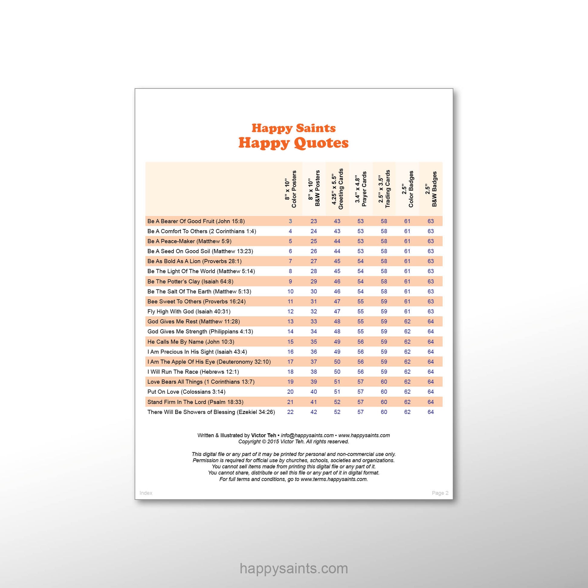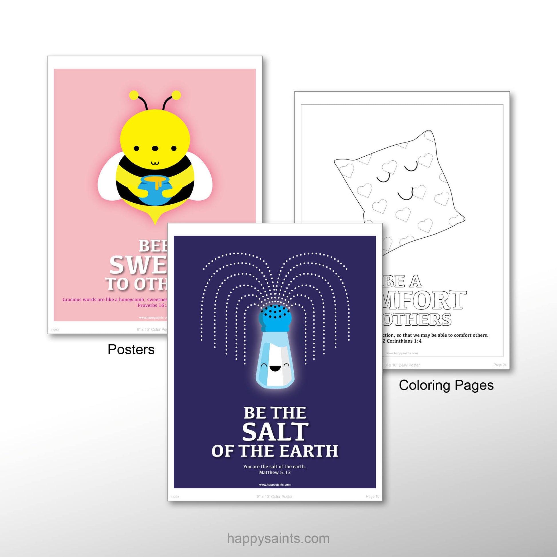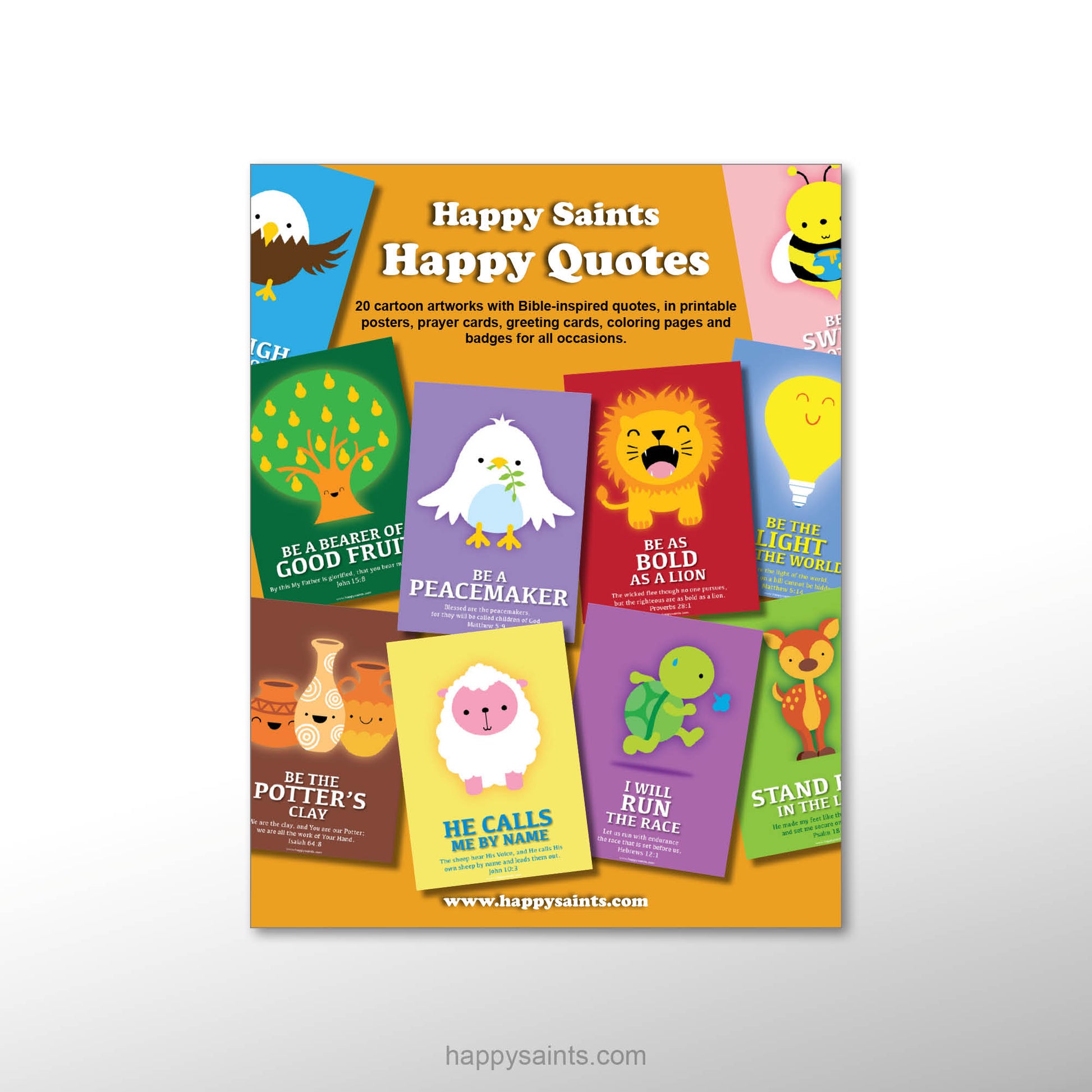 20 cartoon artworks with Bible-inspired quotes. In multiple printable formats, i.e. 8 inch x 10 inch posters, prayer cards, greeting cards, coloring pages and badges for countless activities and occasions. Very useful resource to educate and encourage kids and the young-at-heart to learn and apply the Word of God. Great for parents, teachers, catechists, children and families!