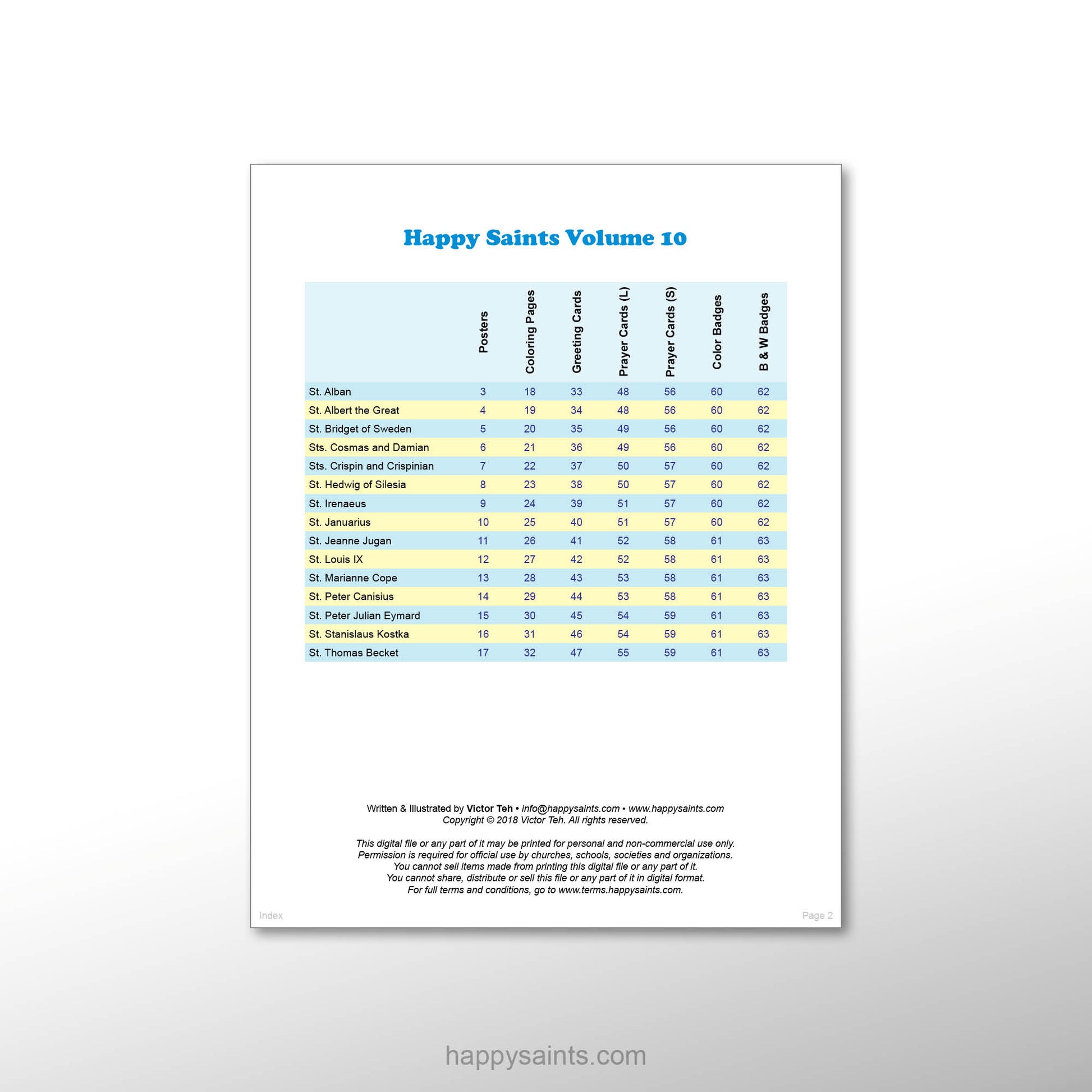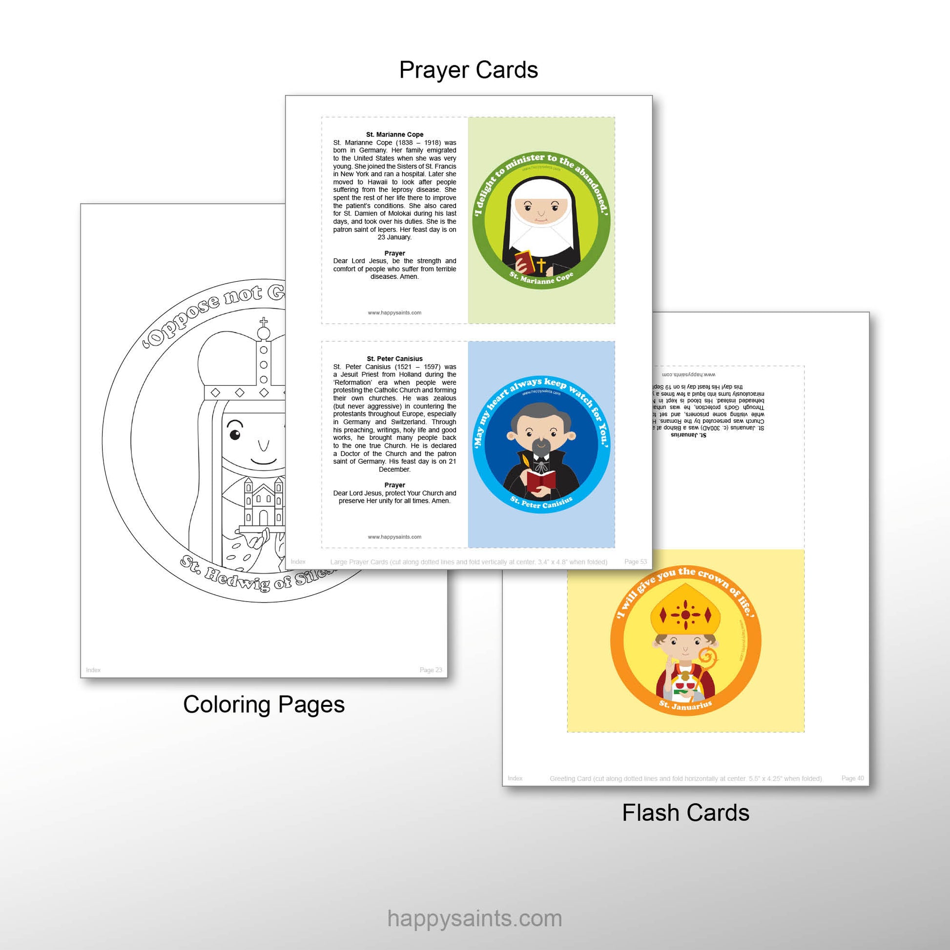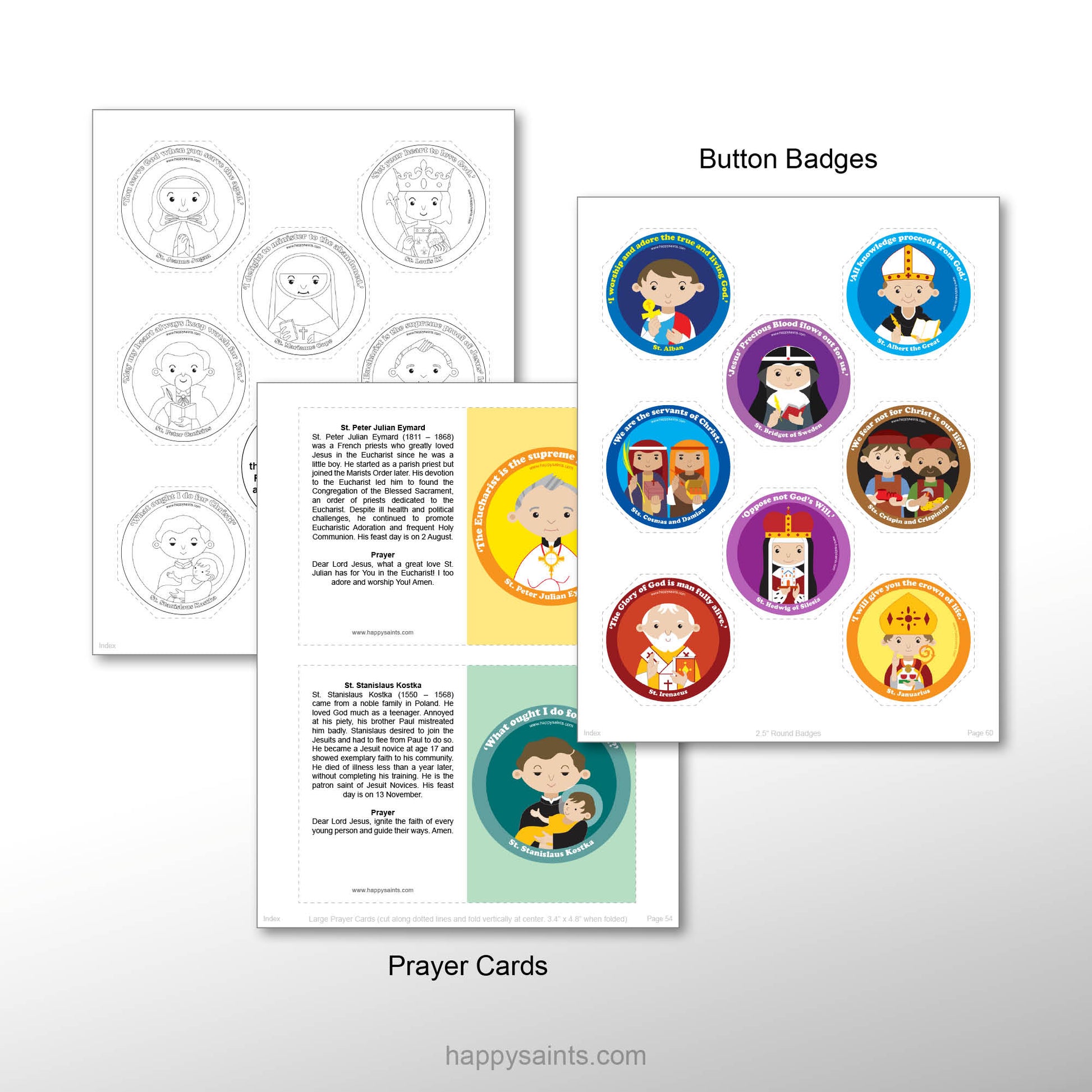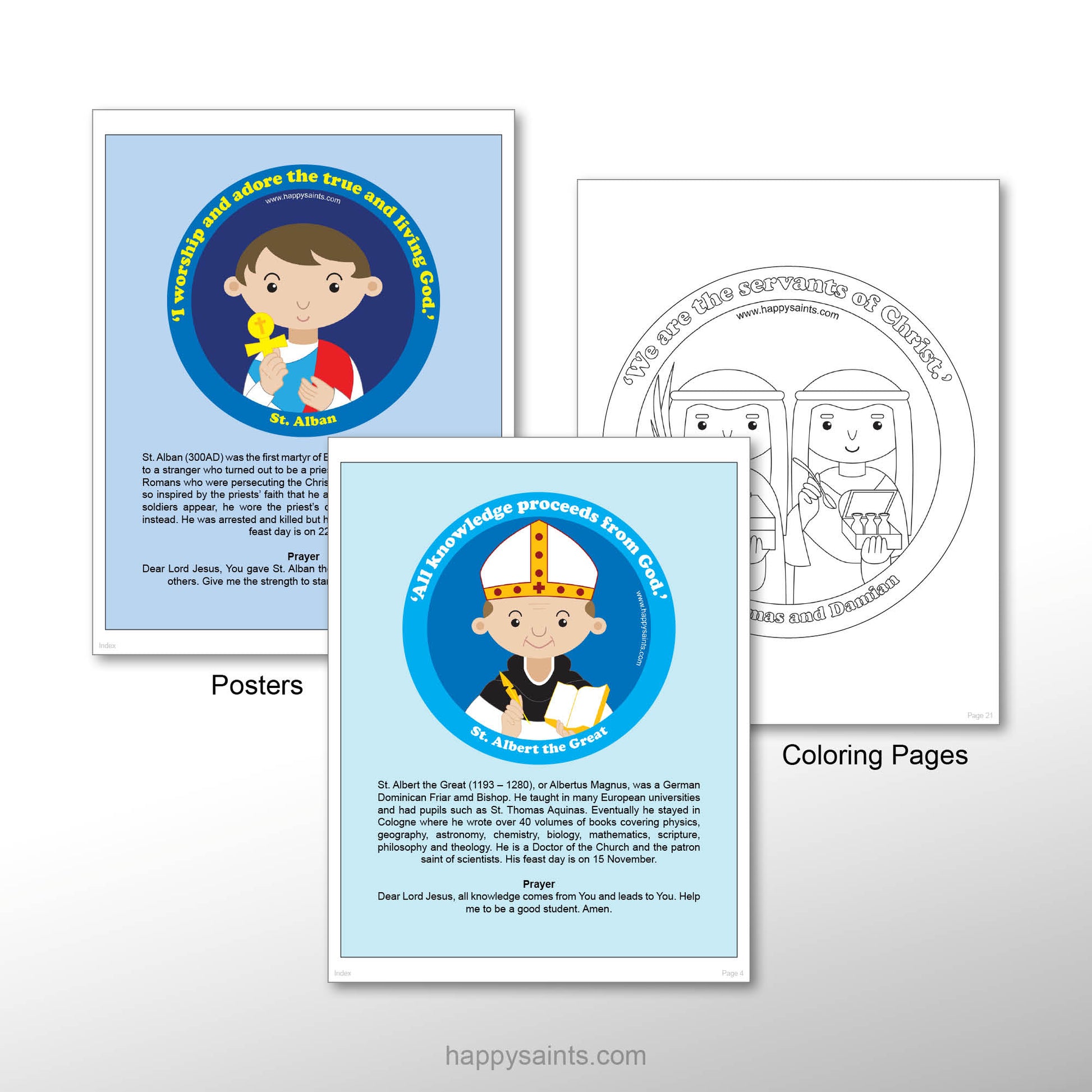 Cartoon artworks of 15 beloved Saints of God with short, simple and succinct biographies and prayers. In multiple printable formats, i.e. 8 inch x 10 inch posters, prayer cards, greeting cards, coloring pages and badges for countless activities and occasions. Very useful resource to educate and encourage kids and the young-at-heart to learn about holy men and women of the Catholic Faith. Great for parents, teachers, catechists, children and families!