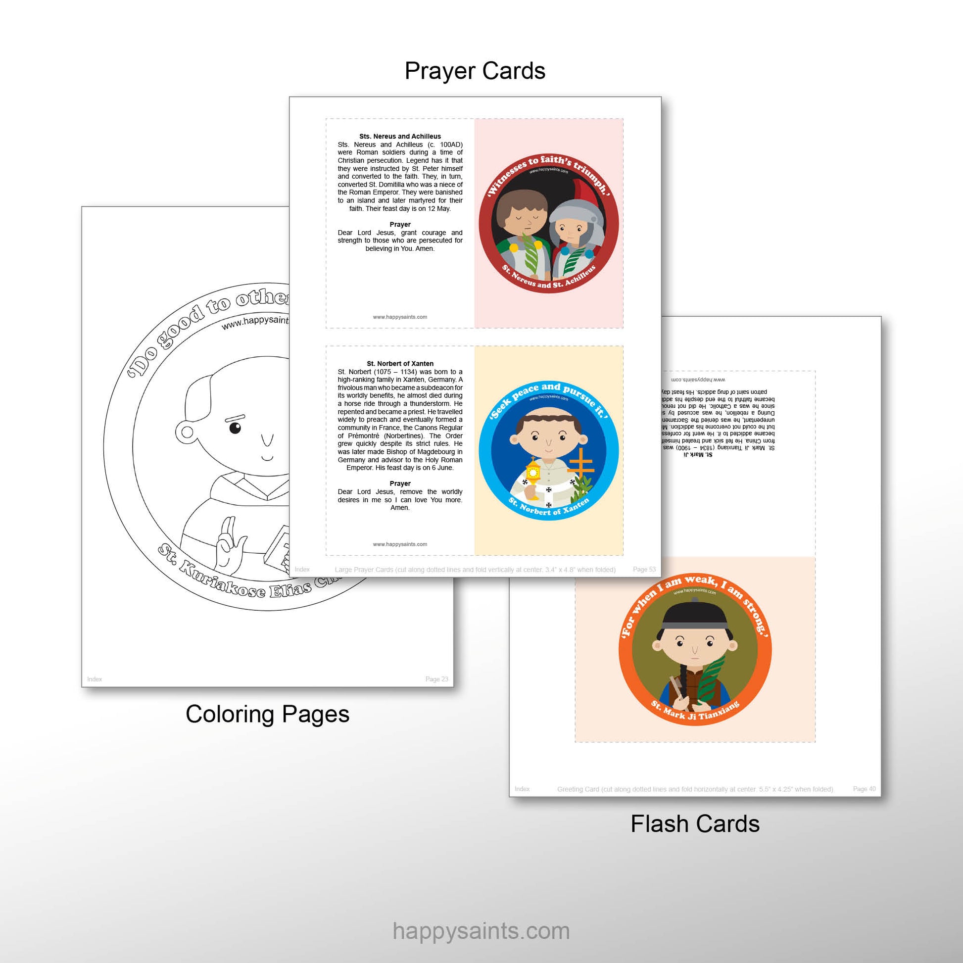 Cartoon artworks of 15 beloved Saints of God with short, simple and succinct biographies and prayers. In multiple printable formats, i.e. 8 inch x 10 inch posters, prayer cards, greeting cards, coloring pages and badges for countless activities and occasions. Very useful resource to educate and encourage kids and the young-at-heart to learn about holy men and women of the Catholic Faith. Great for parents, teachers, catechists, children and families!