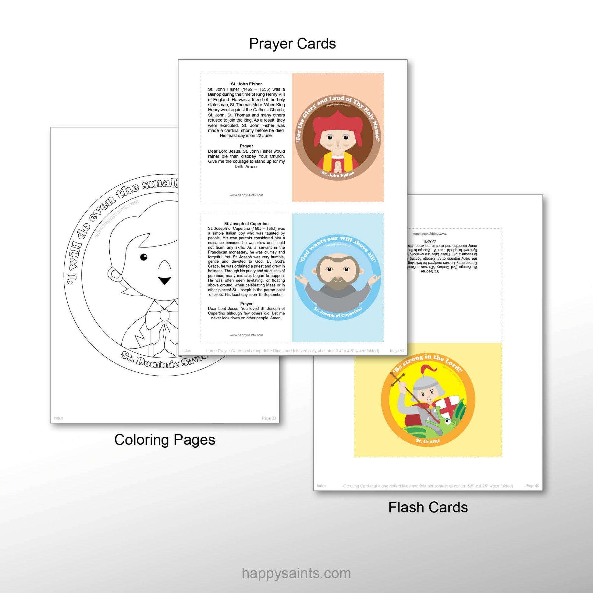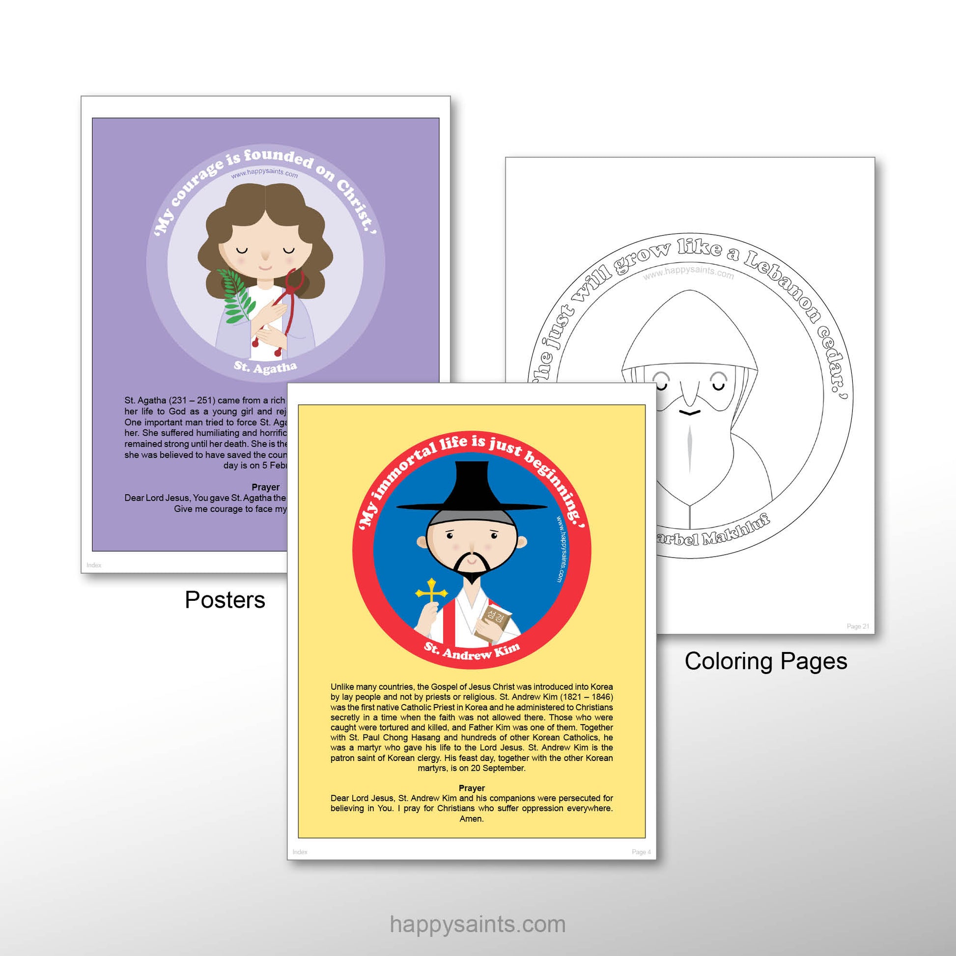 Cartoon artworks of 15 beloved Saints of God with short, simple and succinct biographies and prayers. In multiple printable formats, i.e. 8 inch x 10 inch posters, prayer cards, greeting cards, coloring pages and badges for countless activities and occasions. Very useful resource to educate and encourage kids and the young-at-heart to learn about holy men and women of the Catholic Faith. Great for parents, teachers, catechists, children and families!