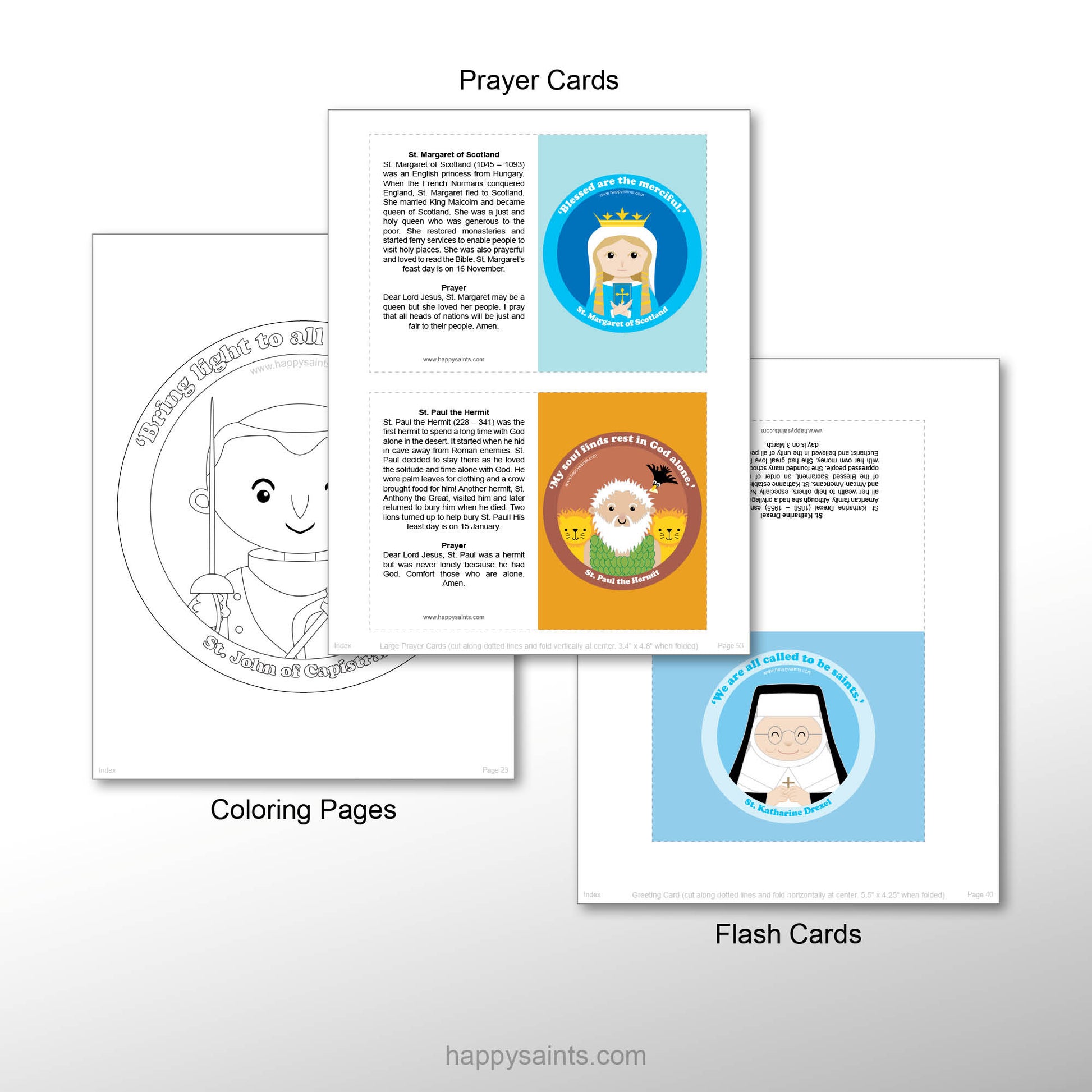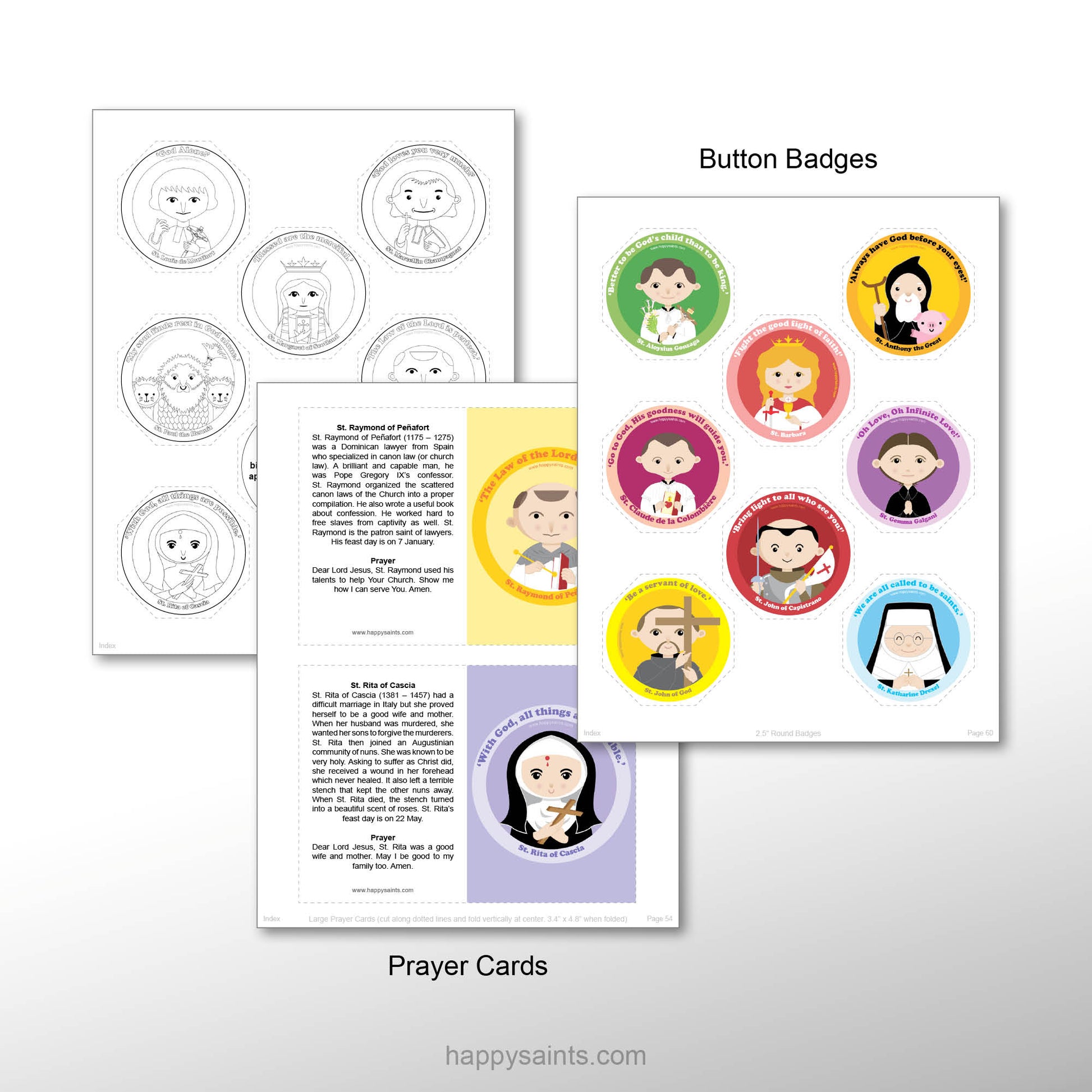 Cartoon artworks of 15 beloved Saints of God with short, simple and succinct biographies and prayers. In multiple printable formats, i.e. 8 inch x 10 inch posters, prayer cards, greeting cards, coloring pages and badges for countless activities and occasions. Very useful resource to educate and encourage kids and the young-at-heart to learn about holy men and women of the Catholic Faith. Great for parents, teachers, catechists, children and families!