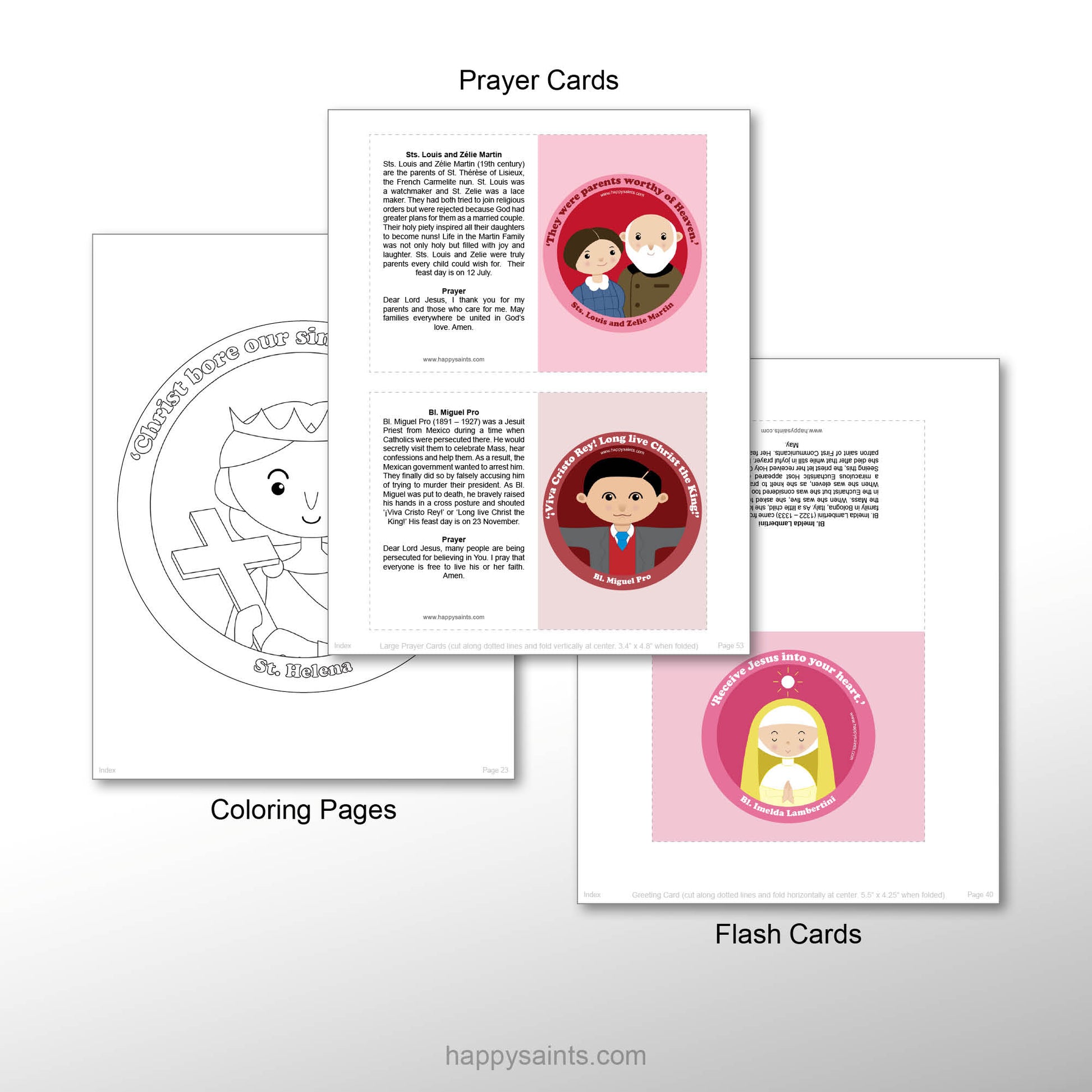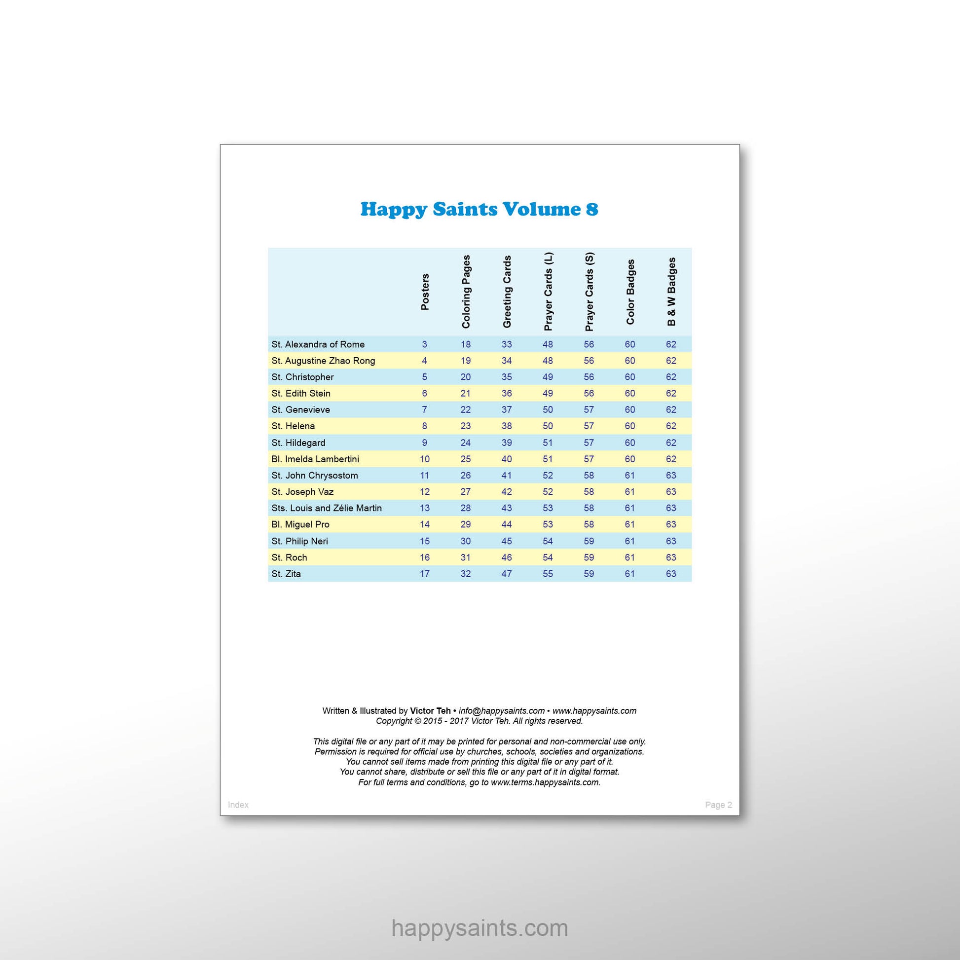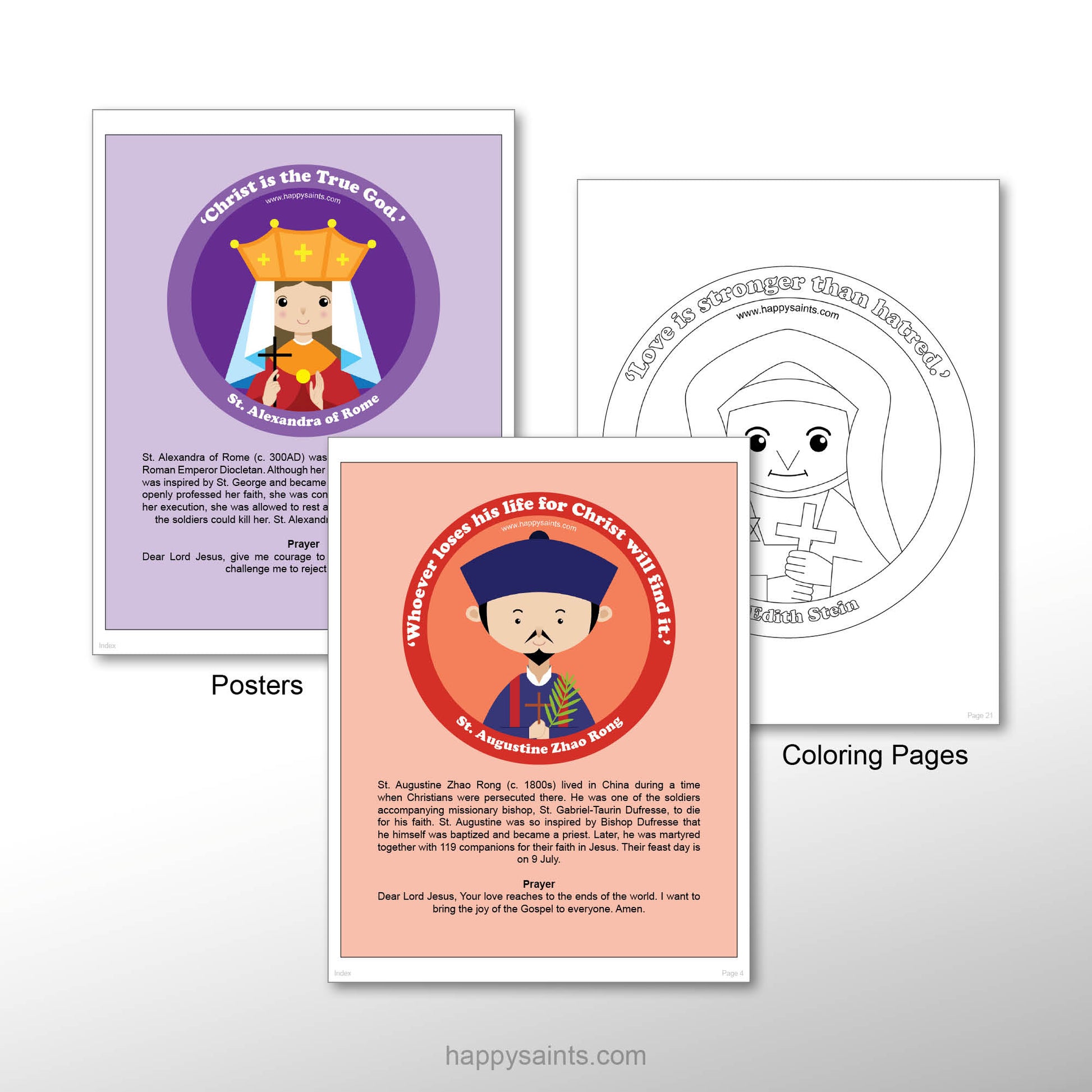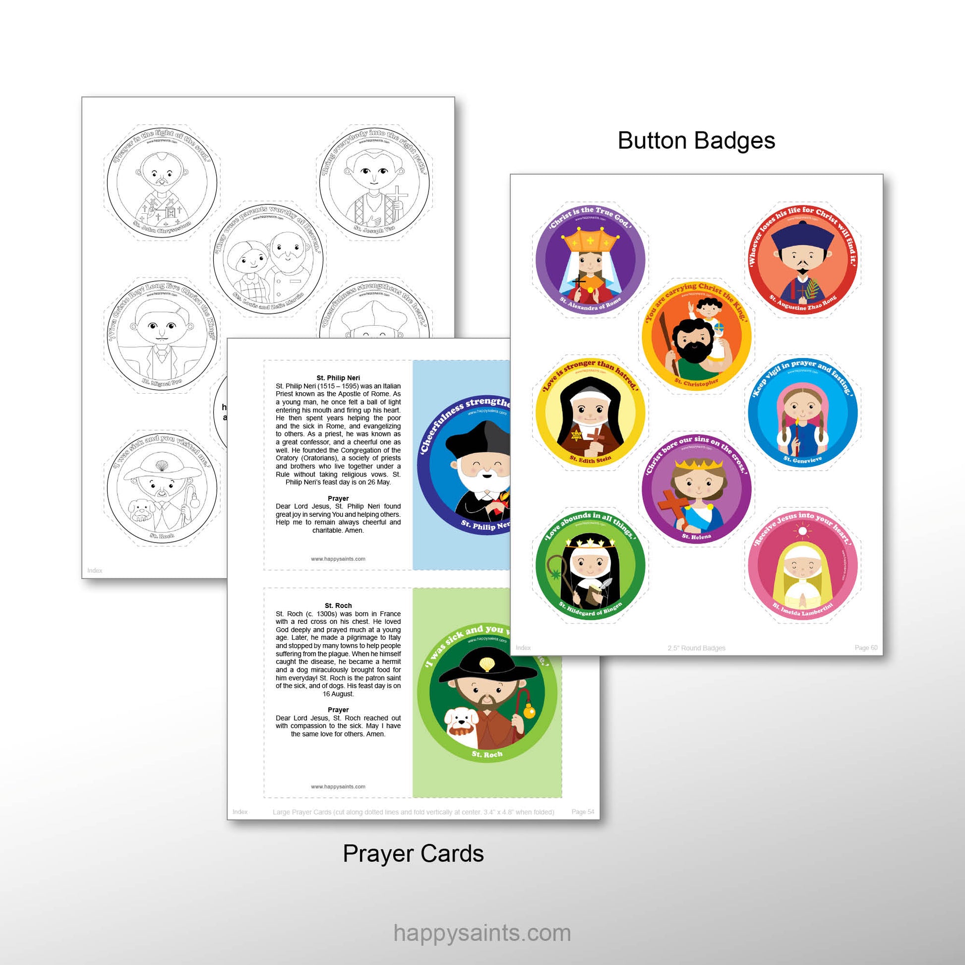 Cartoon artworks of 15 beloved Saints of God with short, simple and succinct biographies and prayers. In multiple printable formats, i.e. 8 inch x 10 inch posters, prayer cards, greeting cards, coloring pages and badges for countless activities and occasions. Very useful resource to educate and encourage kids and the young-at-heart to learn about holy men and women of the Catholic Faith. Great for parents, teachers, catechists, children and families!
