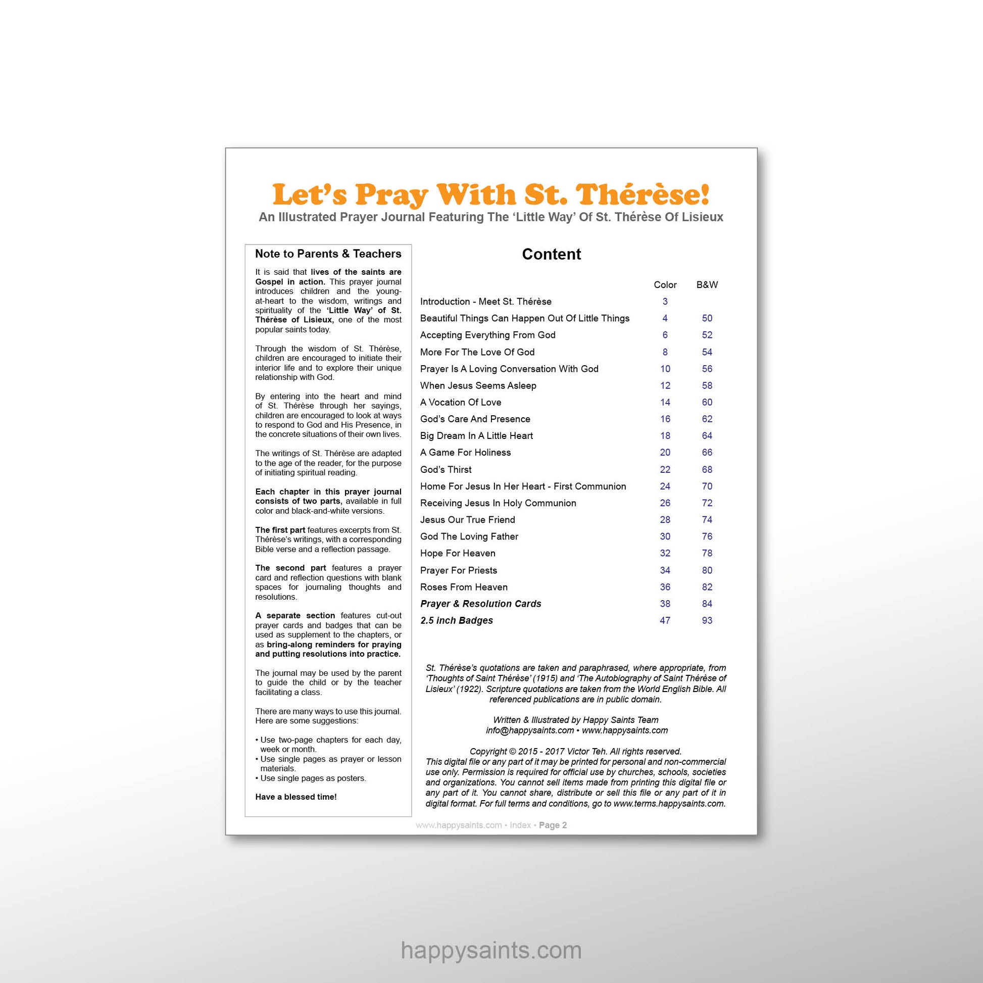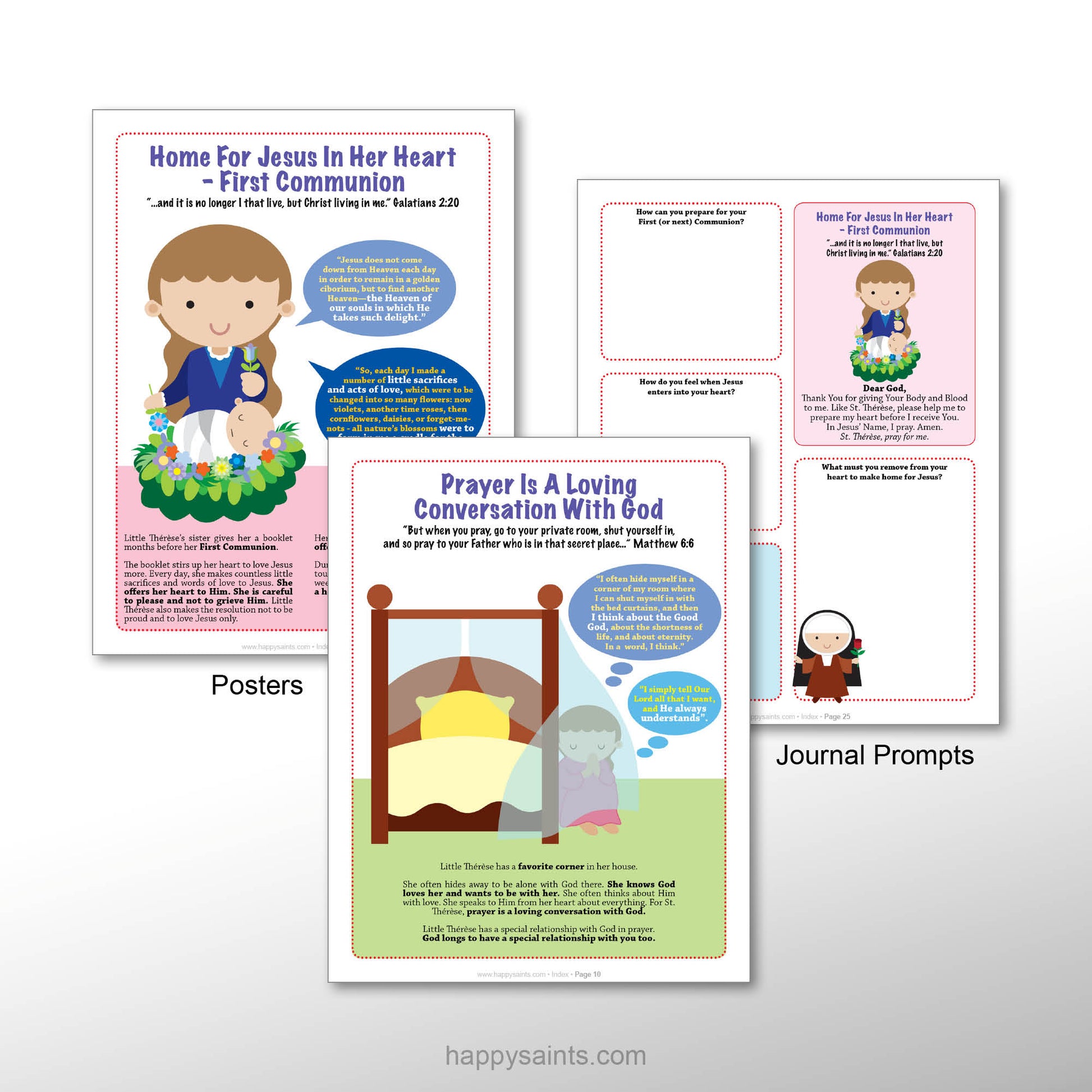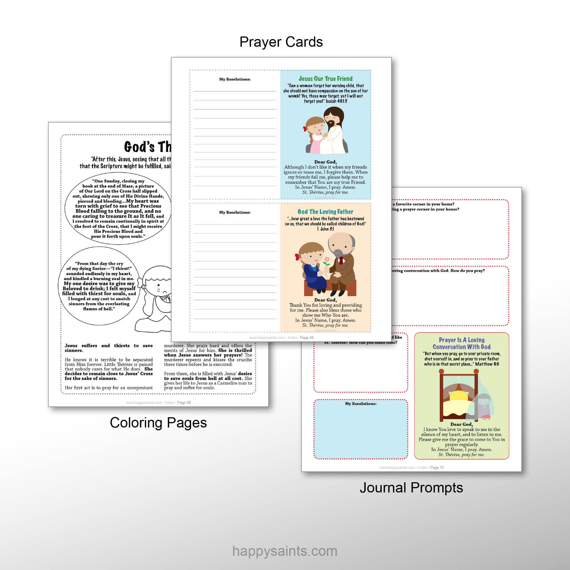 Happy Saints ‘Let’s Pray With St. Thérèse’ eBook is a printable illustrated prayer e-journal featuring the ‘Little Way’ of St. Thérèse of Lisieux. It uses St. Thérèse’s wisdom to encourage the young and young-at-heart to explore their unique relationship with God.