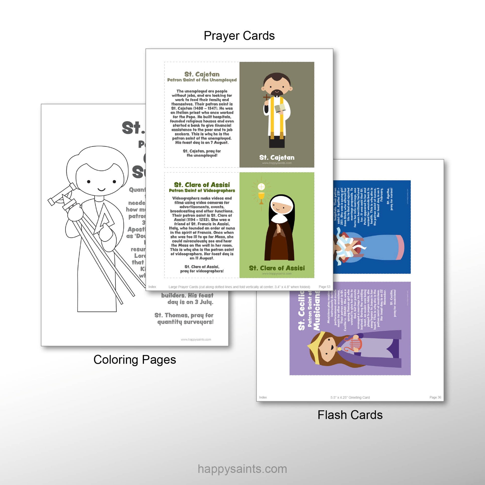 Cartoon artworks of patron saints of 26 jobs in alphabetical order. Includes short stories on why these saints are the respective patrons of particular occupations. In printable posters, prayer cards, game cards, greeting cards, coloring pages and badges. Great for Catholic religious education, family activities and personal spiritual growth.