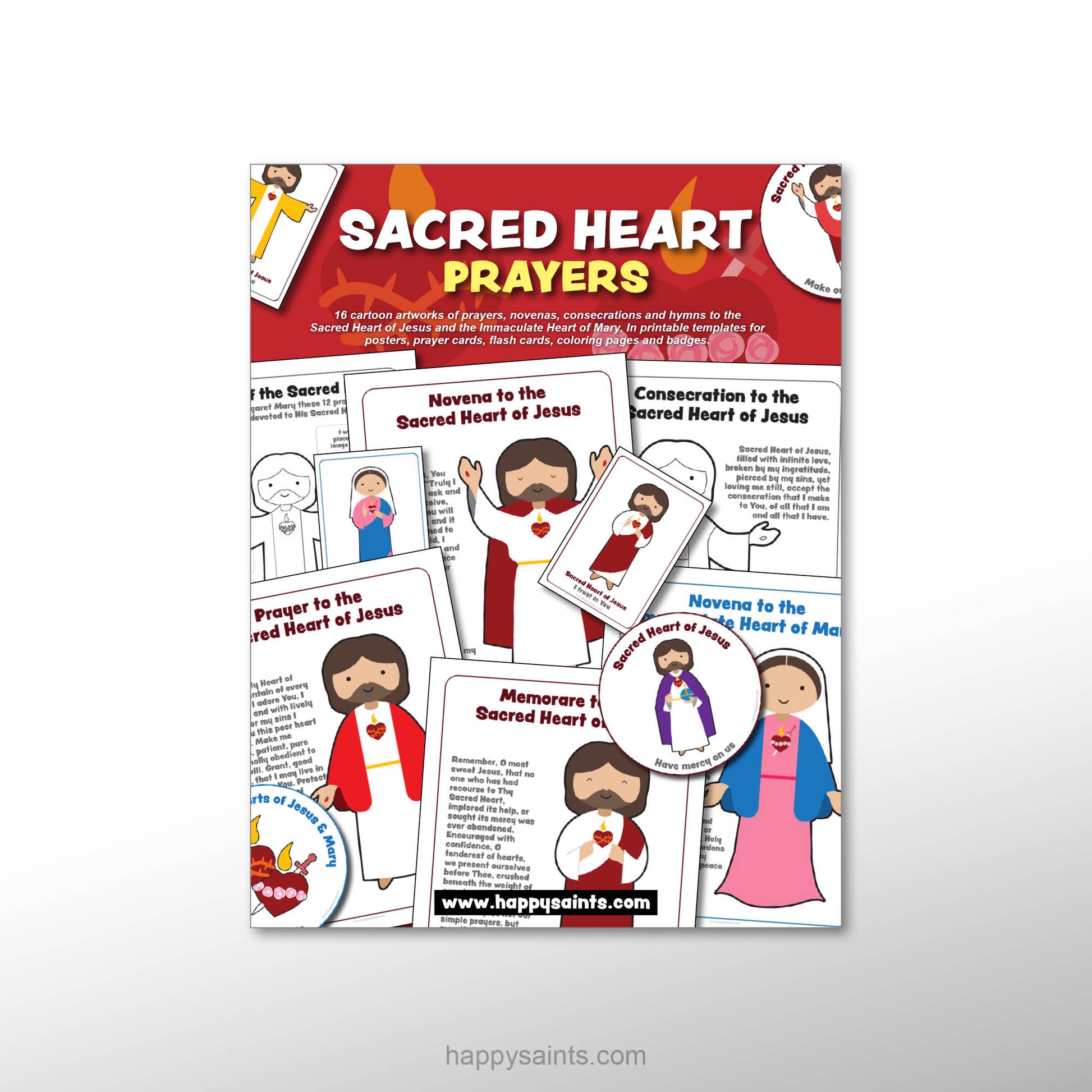 16 cartoon artworks of prayers, novenas, consecrations and hymns to the Sacred Heart of Jesus and the Immaculate Heart of Mary. In printable templates for posters, prayer cards, flash cards, coloring pages and badges.