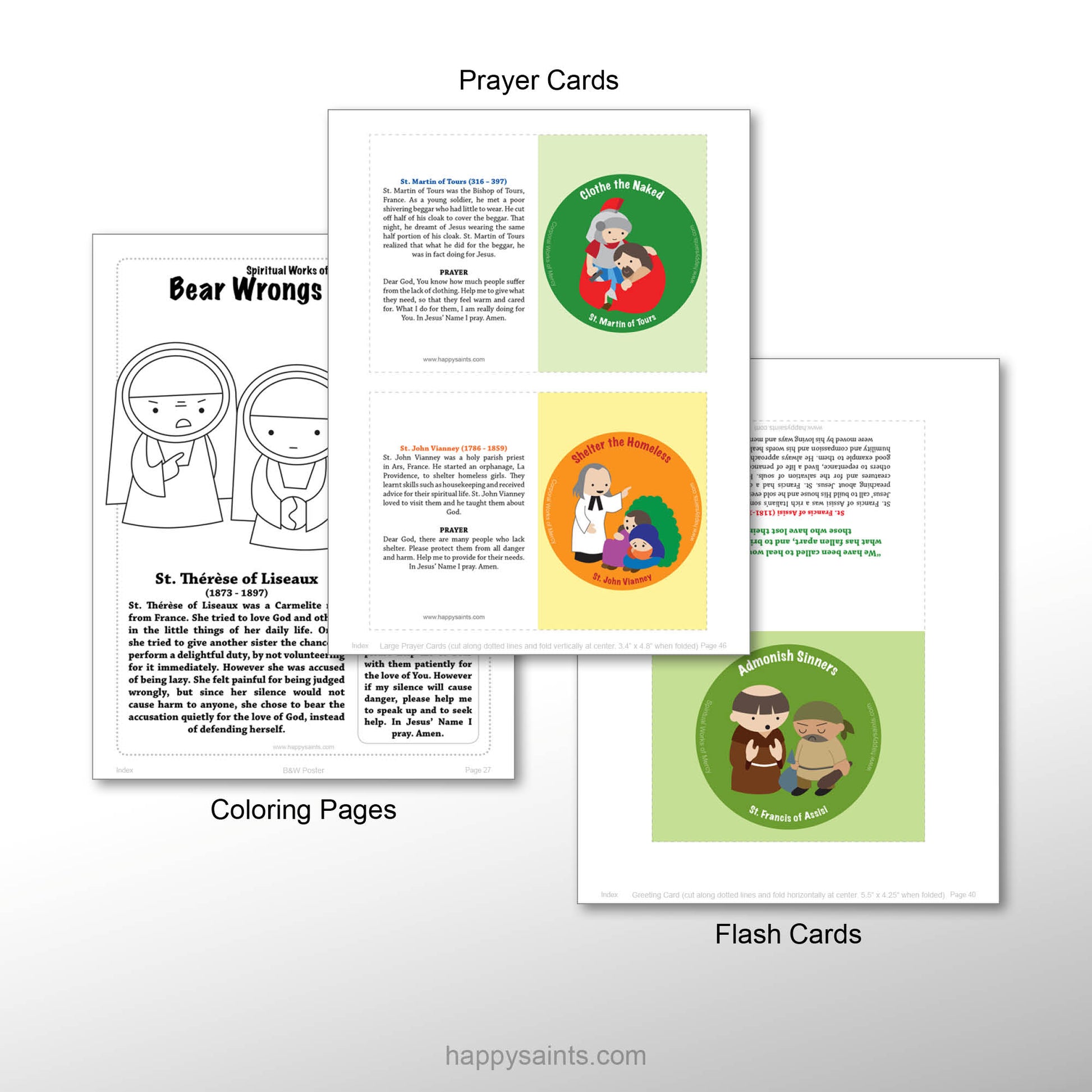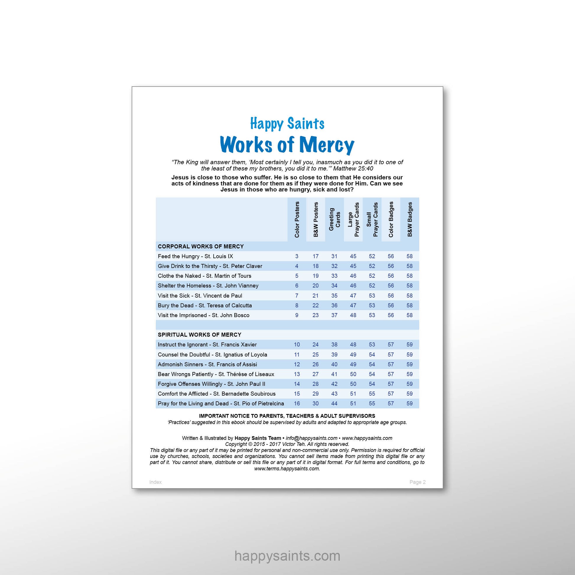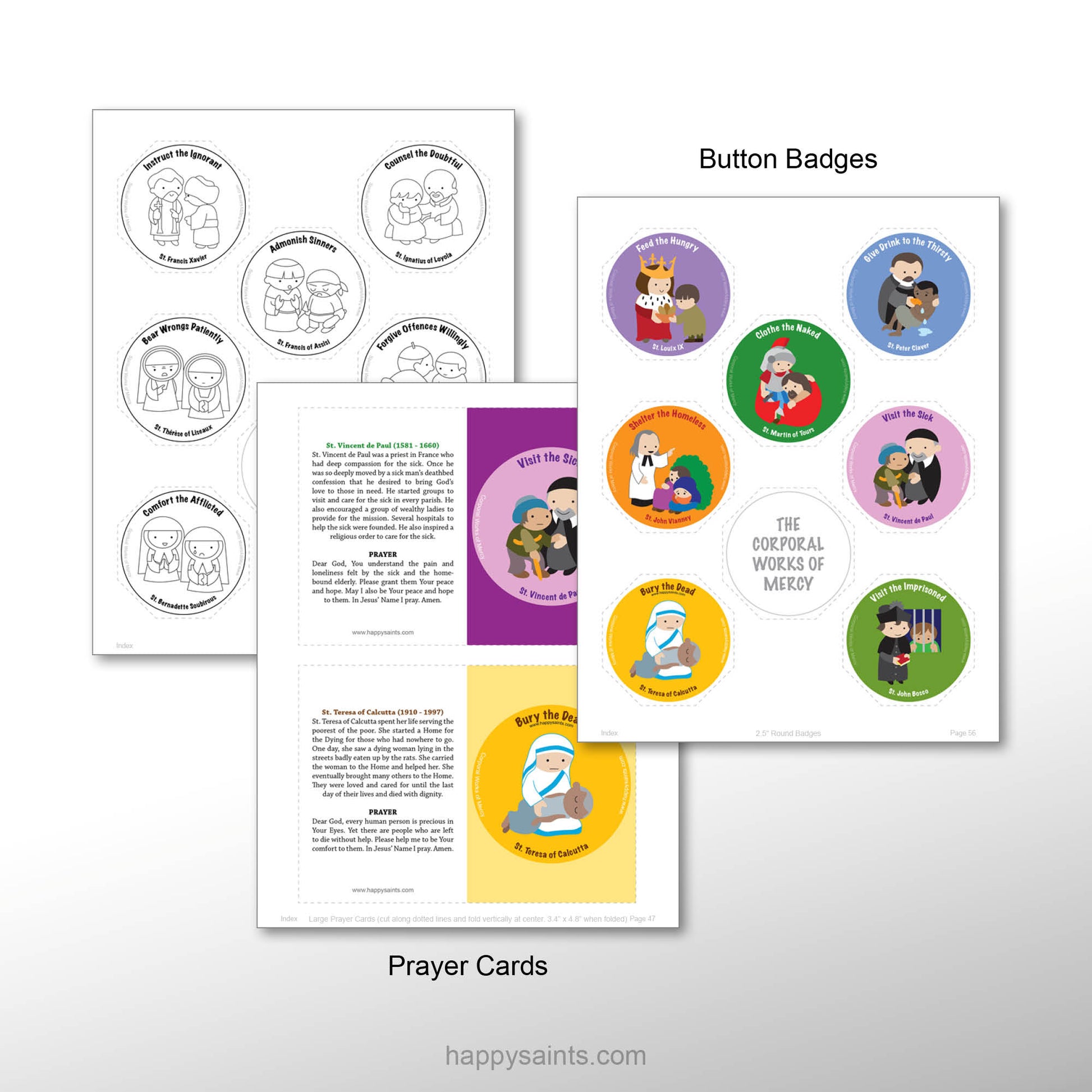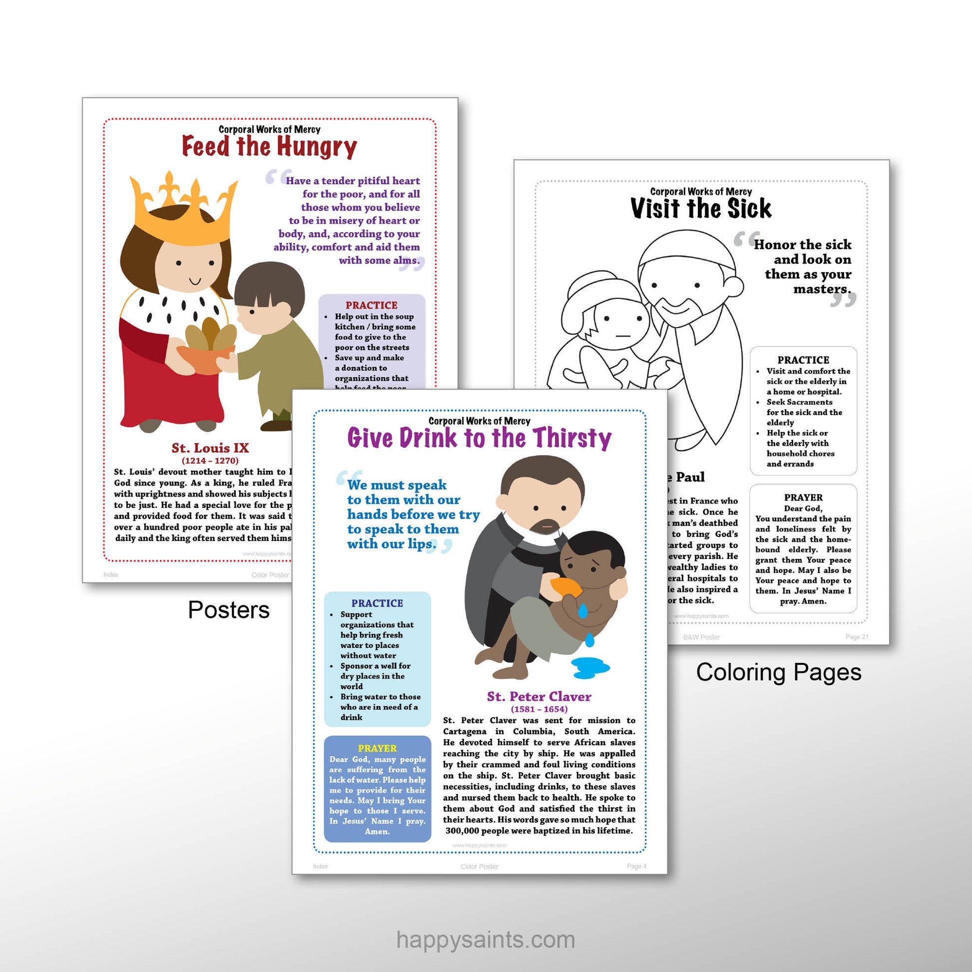 14 cartoon artworks of the corporal and spiritual works of mercy as practiced by the Saints of God, with short prayers and passages. In multiple printable formats, i.e. 8 inch x 10 inch posters, prayer cards, greeting cards, coloring pages and badges for countless activities and occasions. Very useful resource to educate and encourage kids and the young-at-heart to pray. Great for parents, teachers, catechists, children and families!